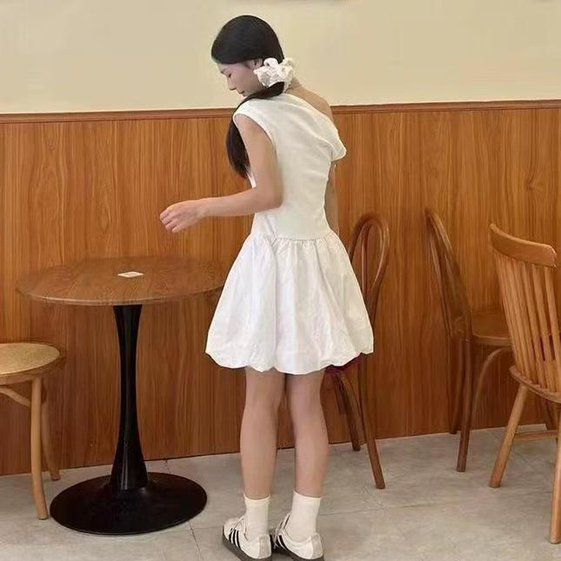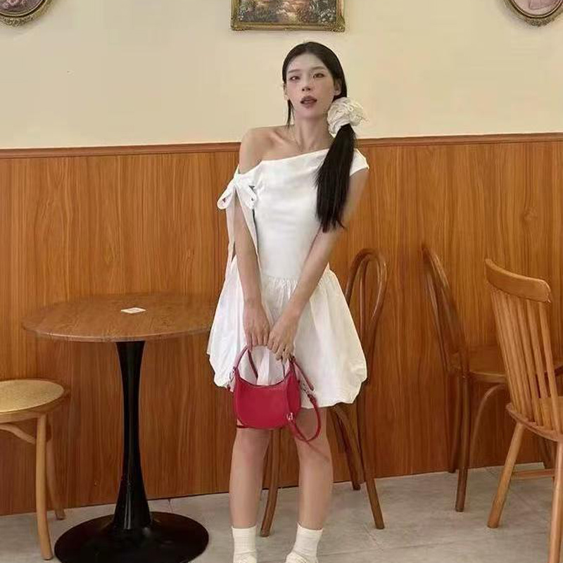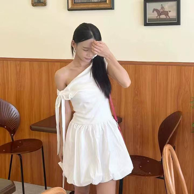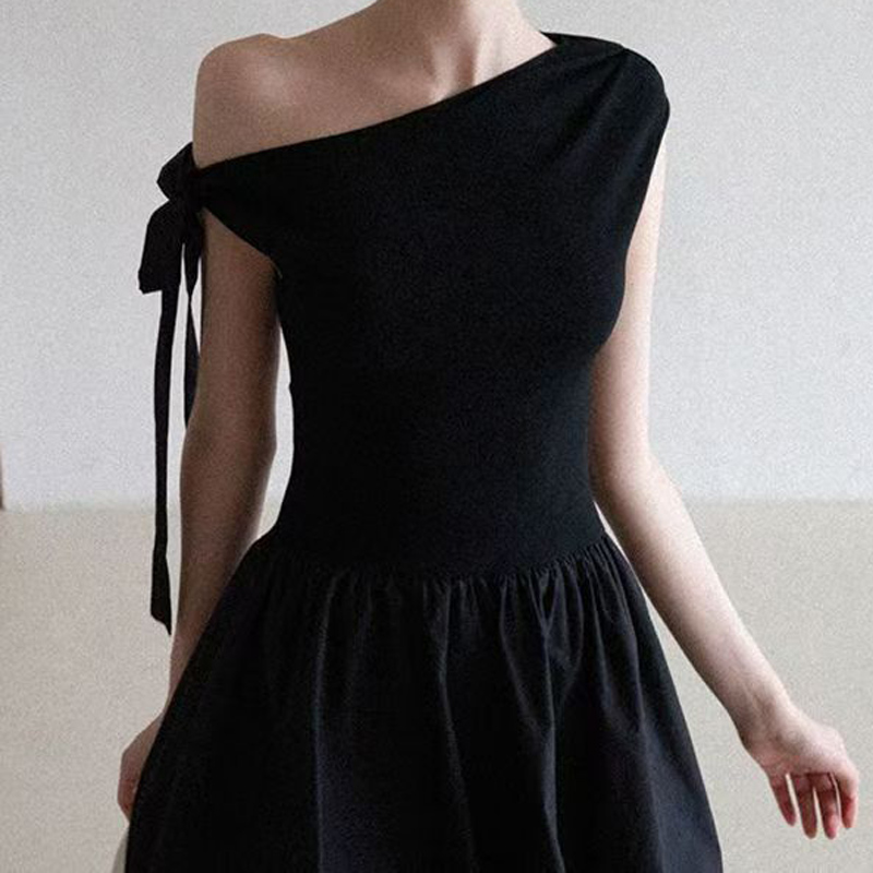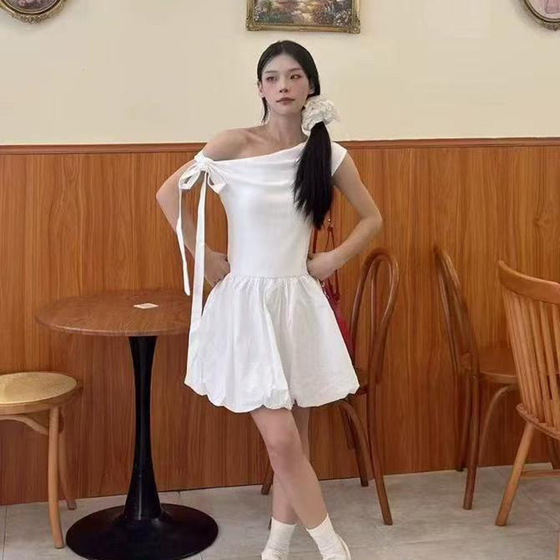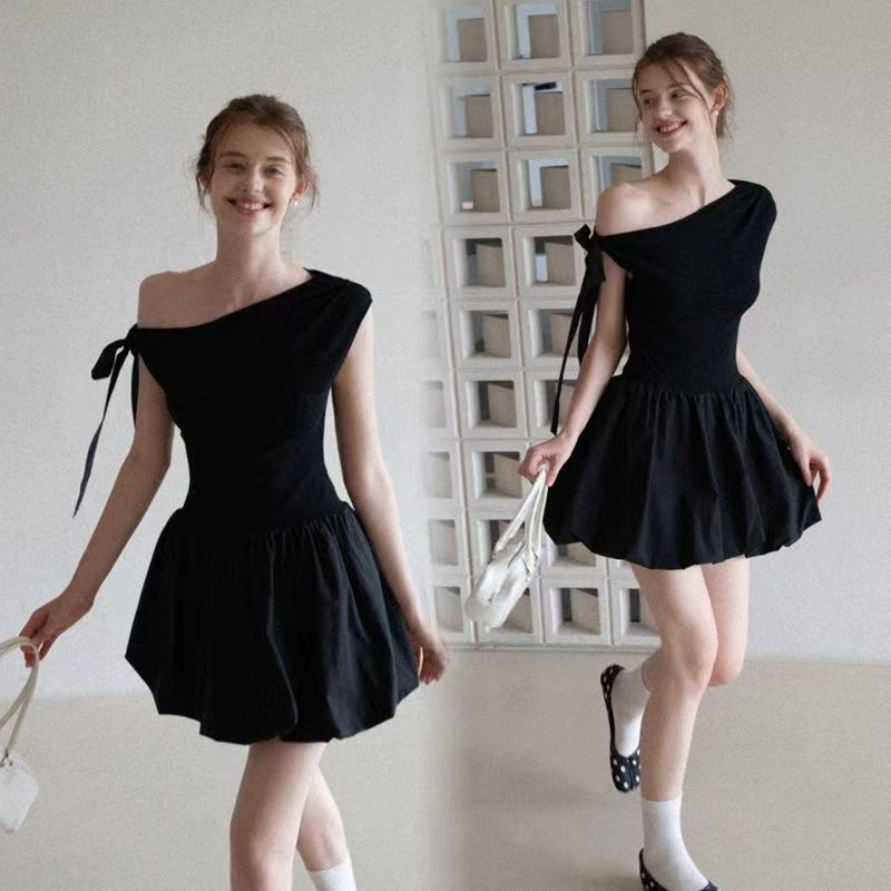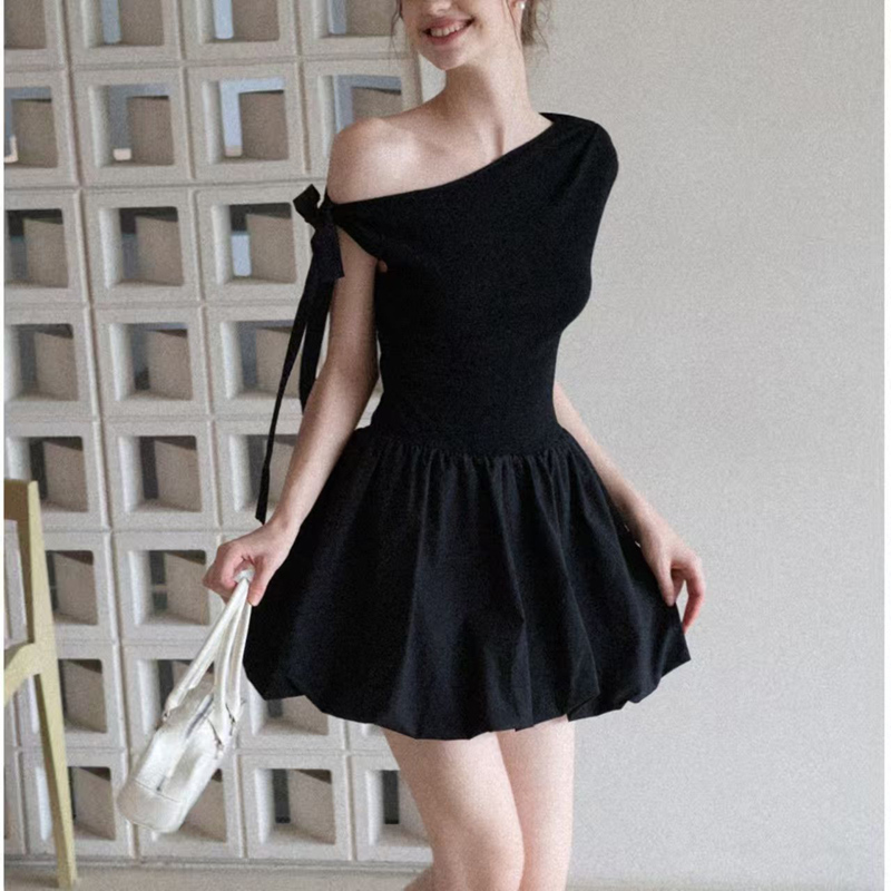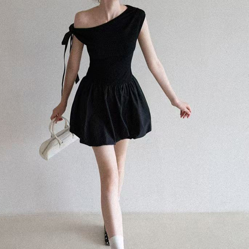 YF6026-(2色入内)小可爱无袖侧蝴蝶结露肩假腰褶折花苞复古设计短款连衣裙
