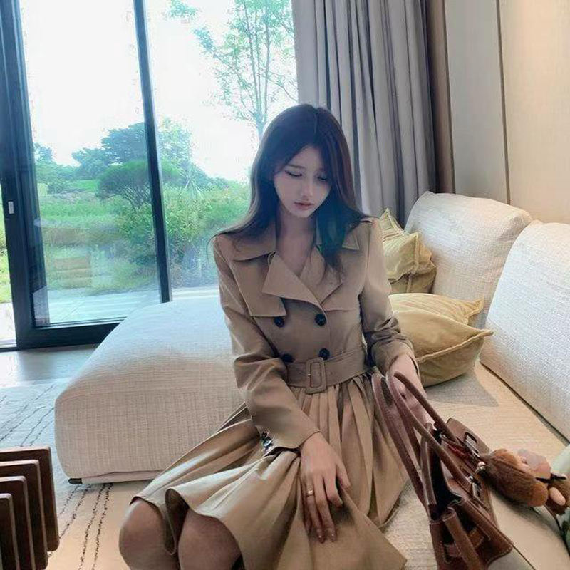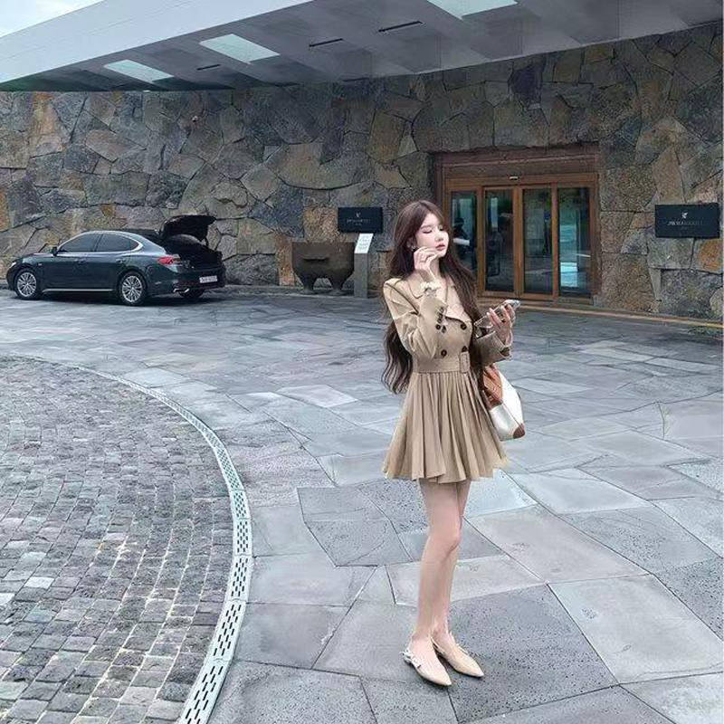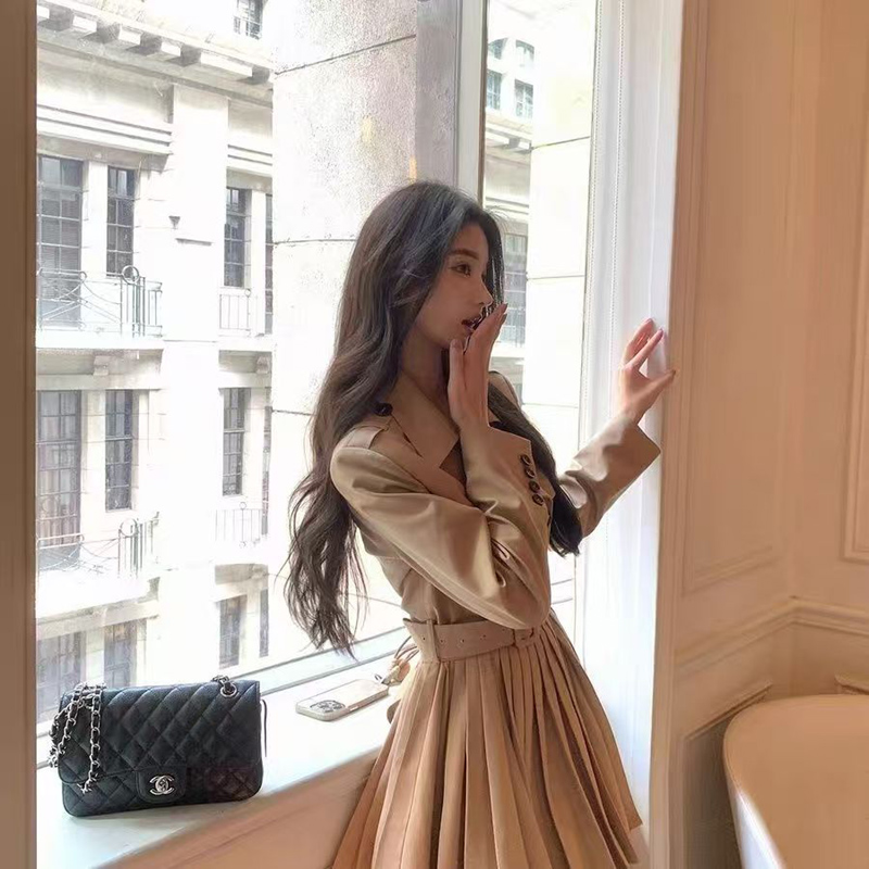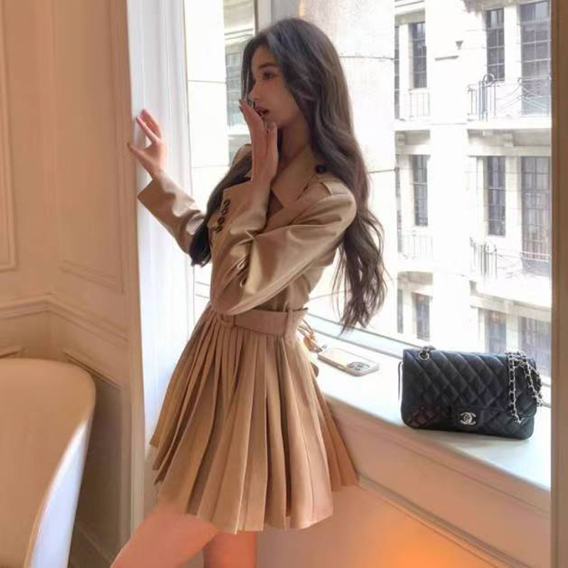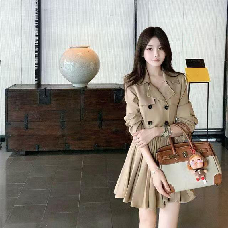 YF6028-图片色英伦风POLO领长袖双排扣系腰带百褶拼接短款卡其色连衣裙