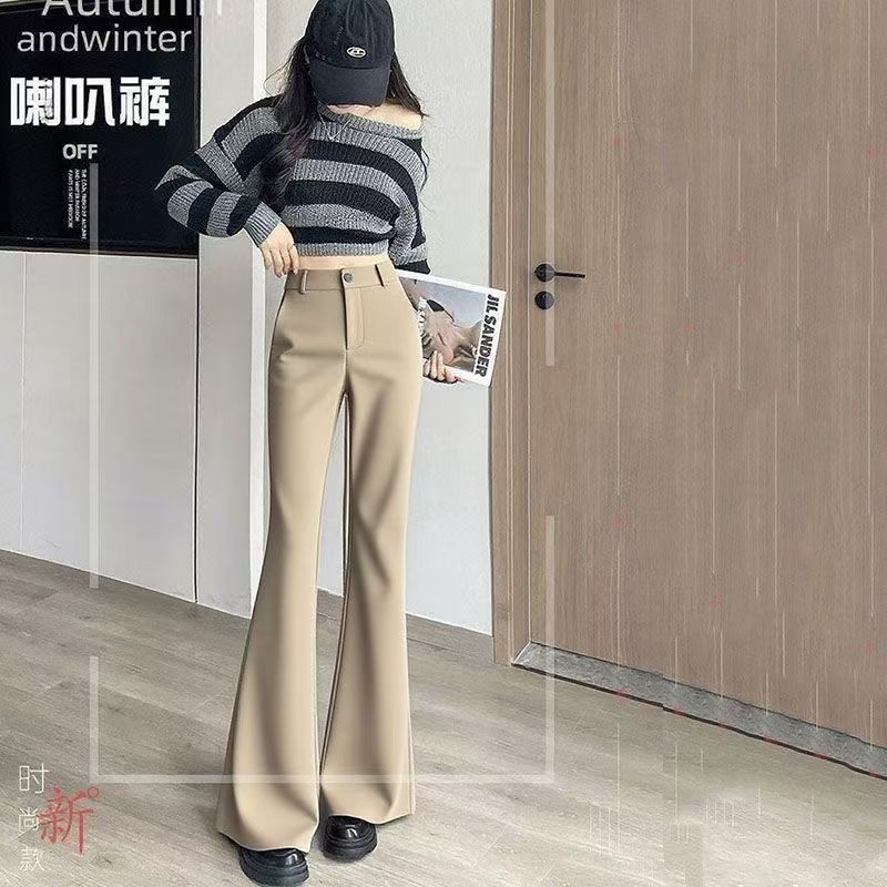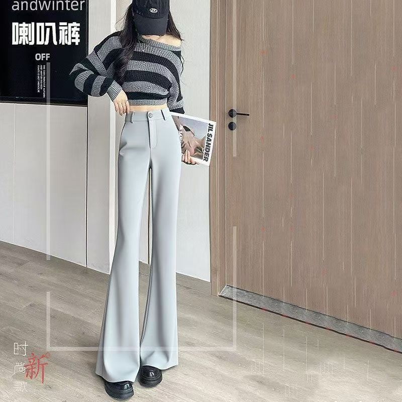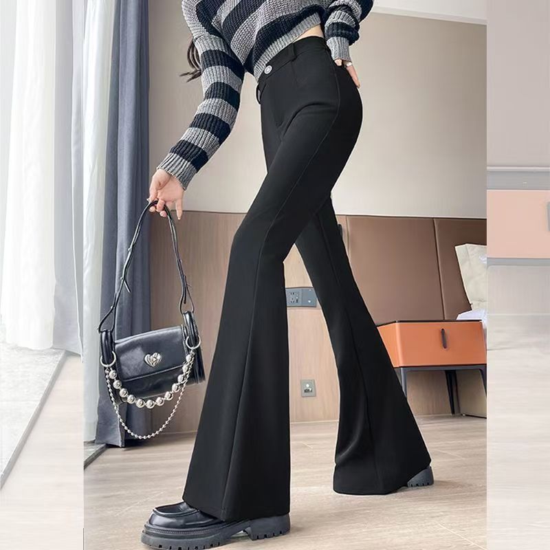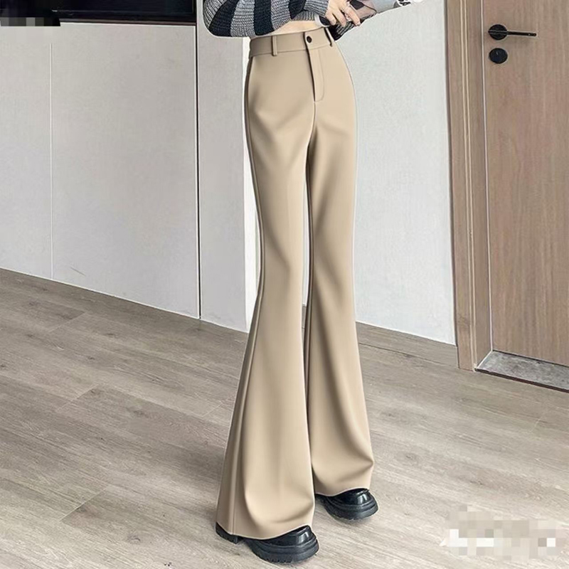YF6031-(3色入内)时尚韩版系扣高腰微喇叭坠地感别致收腰显瘦休闲西裤