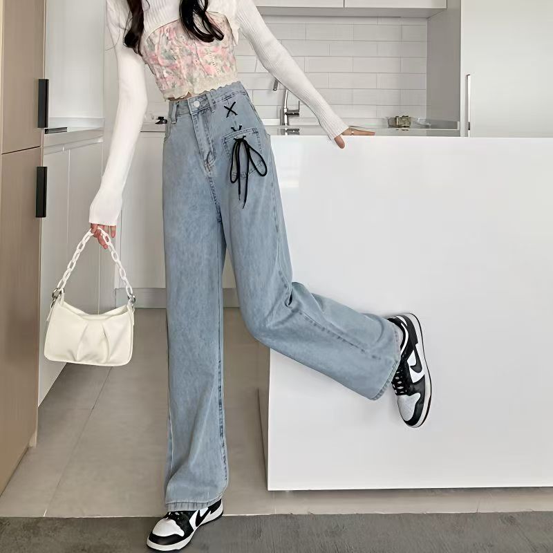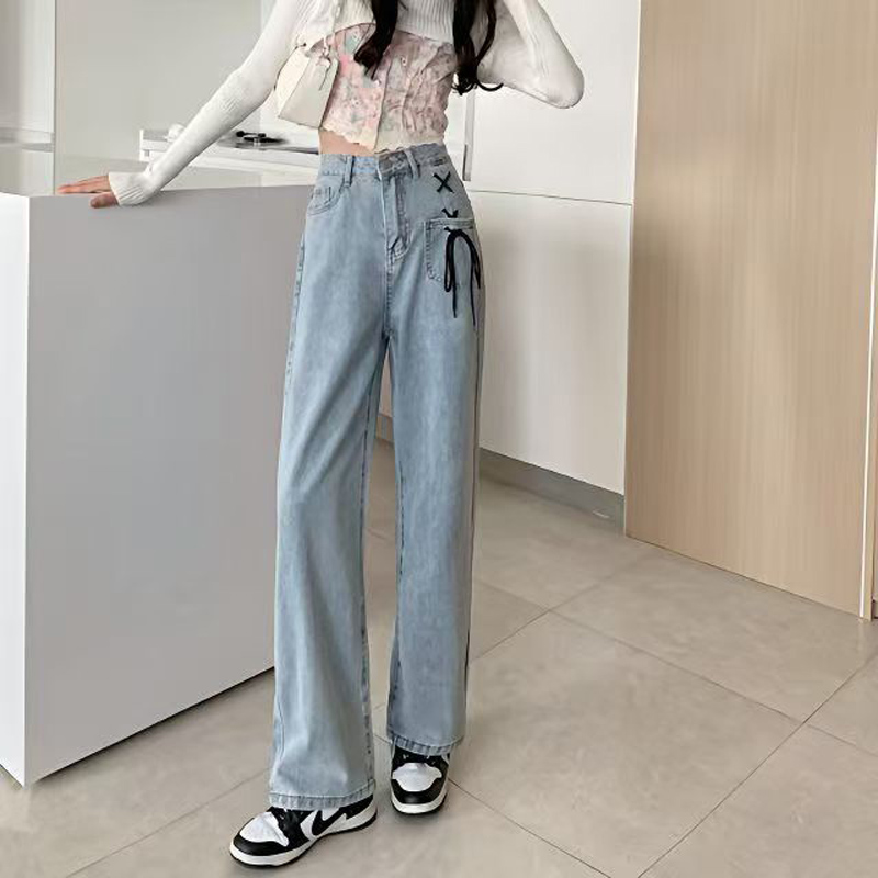 YF6035-图片色港式小心机交叉绑绳个性口袋系扣高腰直筒蓝色牛仔裤