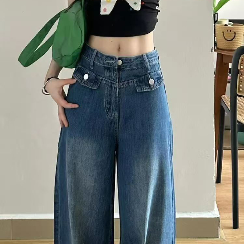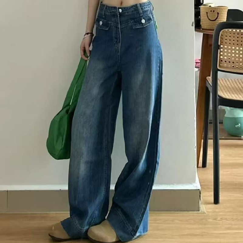 YF6041-图片色新款美式系扣高腰双口袋工装直筒坠地感洗水复古牛仔裤
