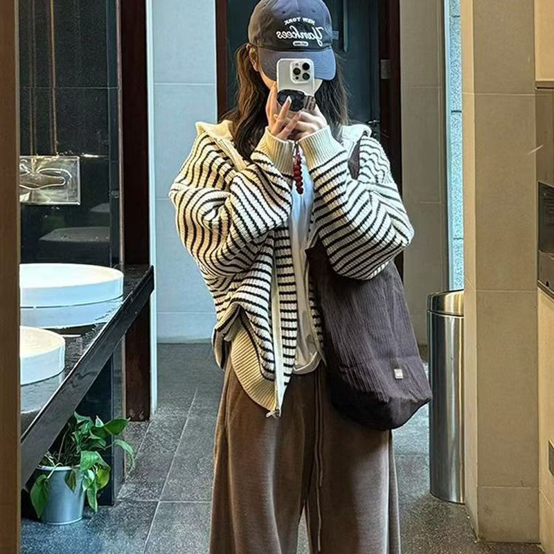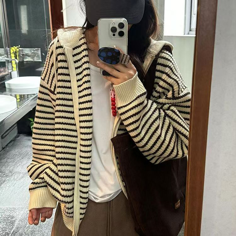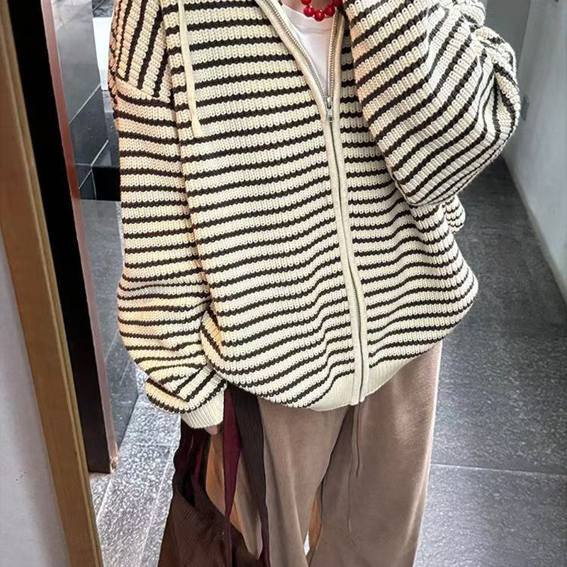 YF6051-图片色韩款学院风长袖连帽拉链条纹宽松大码休闲百搭针织上衣