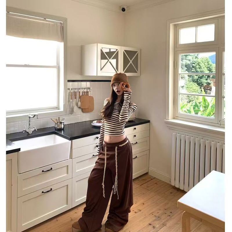 YF6061-图片色一字肩小辣椒露肩长袖复古条纹弹力修身小众设计感上衣