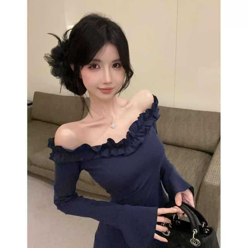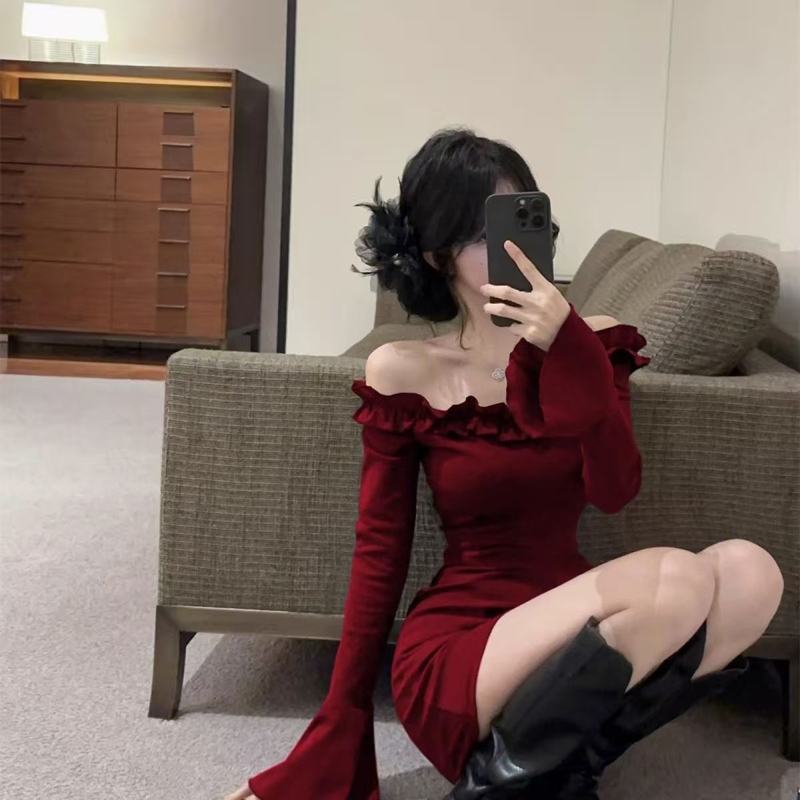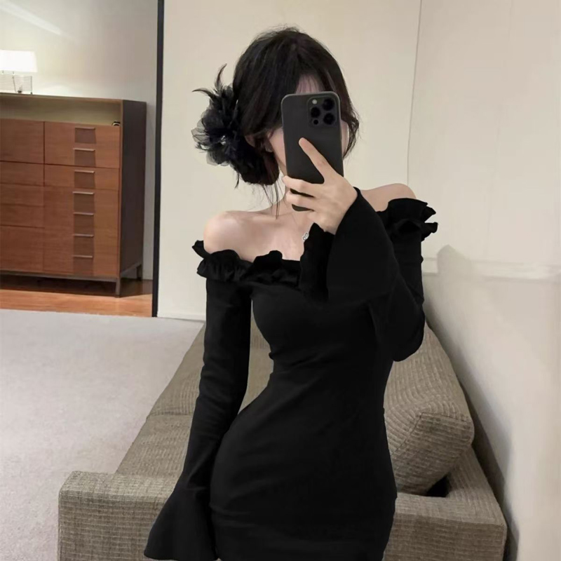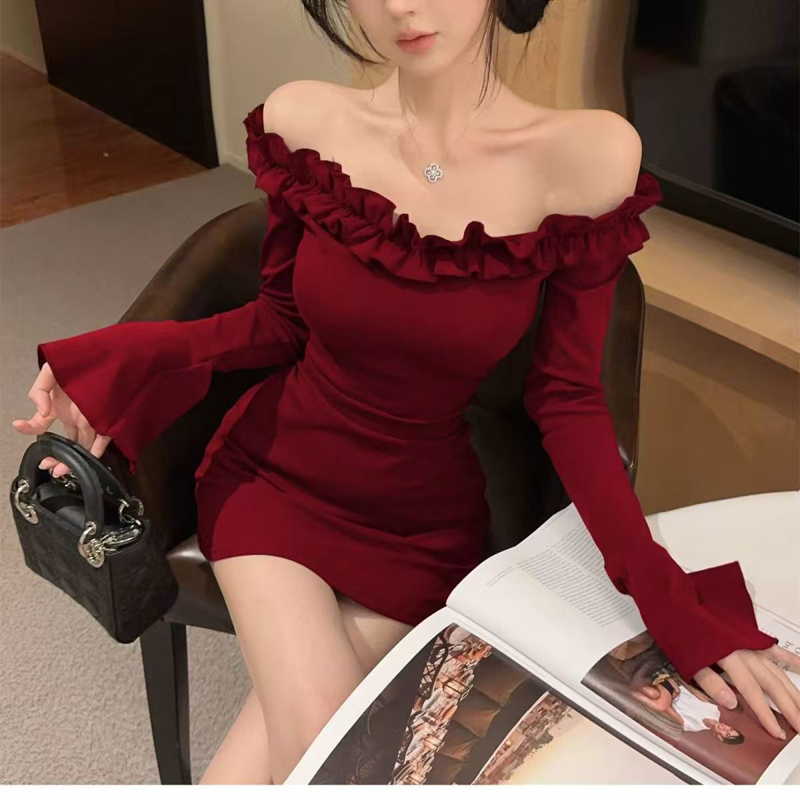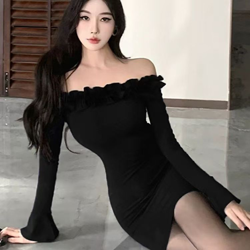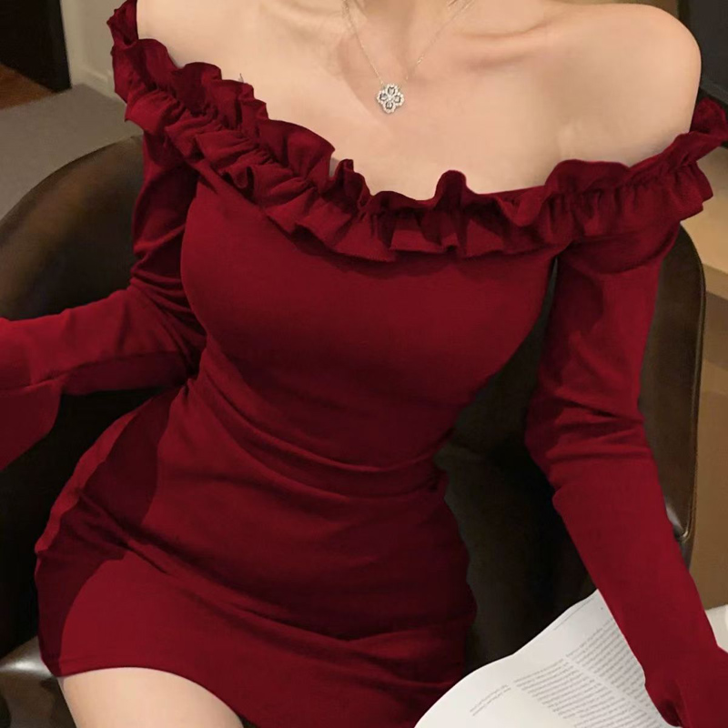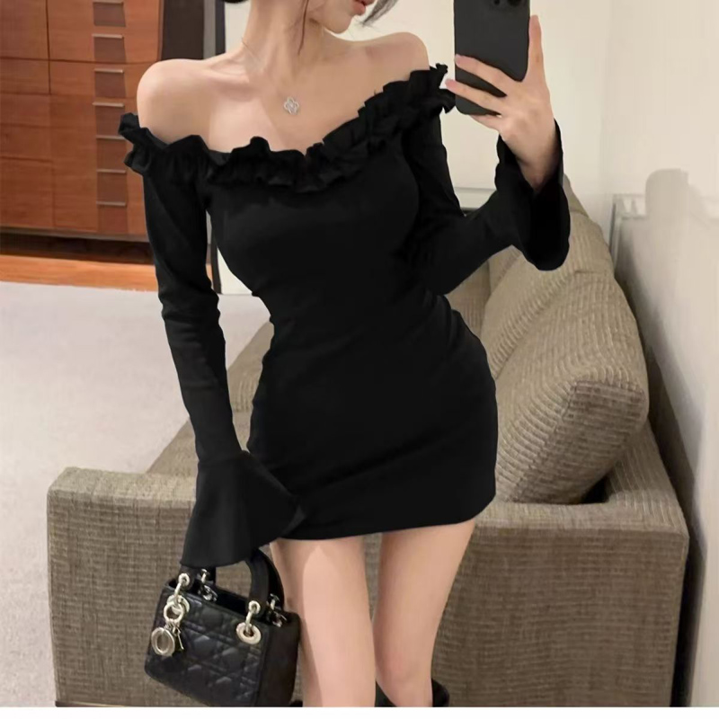 YF6066-(3色入内)性感时尚荷叶边一字肩长袖弹力修身包臀纯欲风短裙