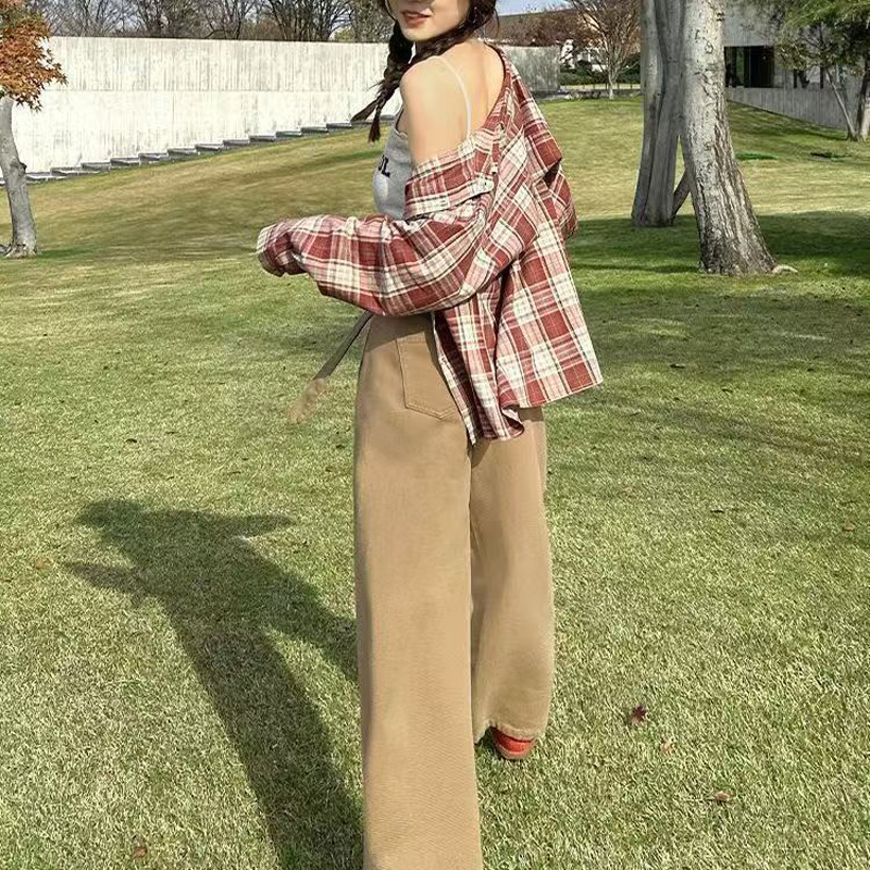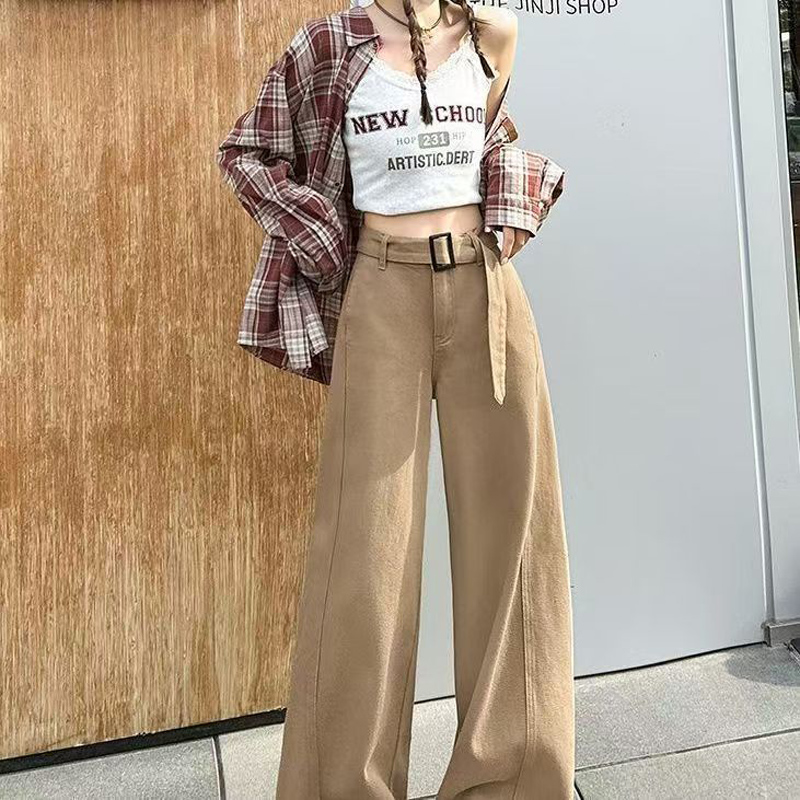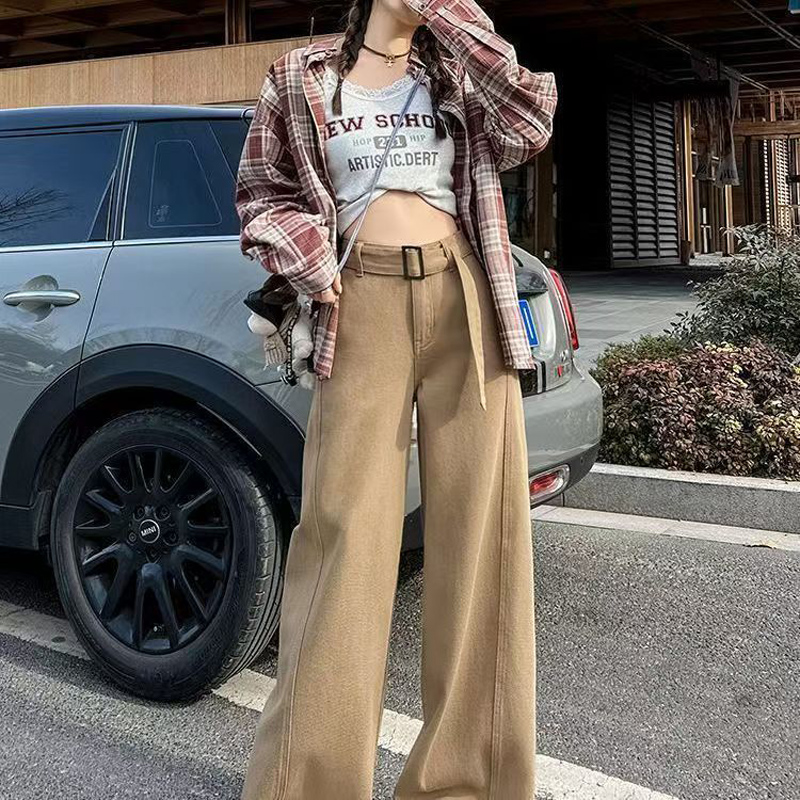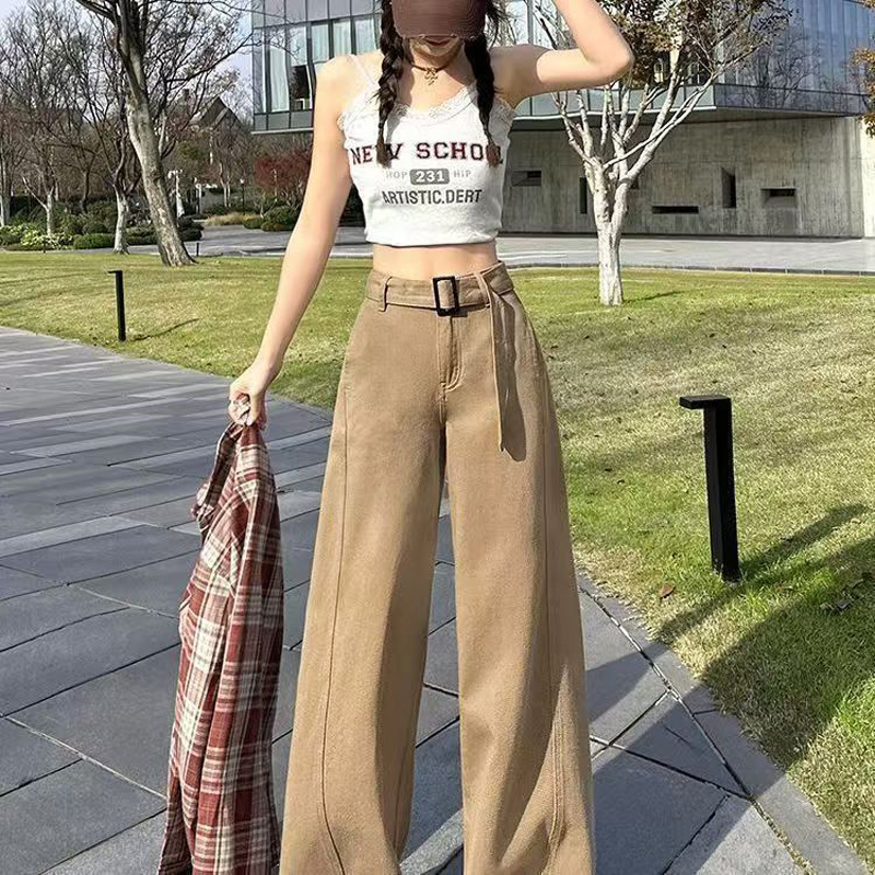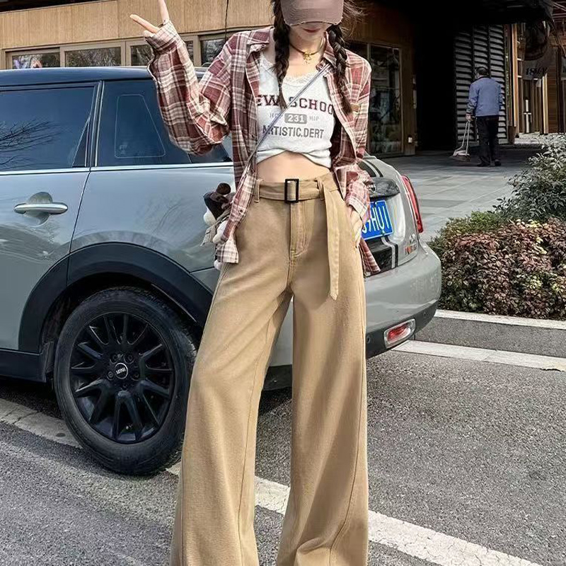 YF6069-图片色港式系扣高腰直筒卡其色小清新设计感系腰带坠地感牛仔裤