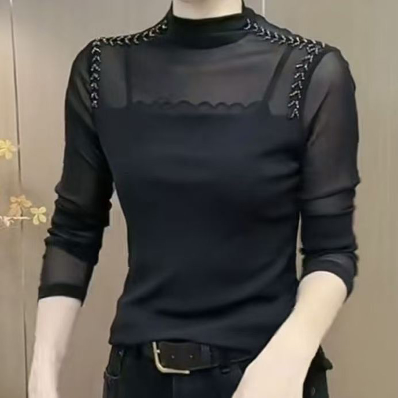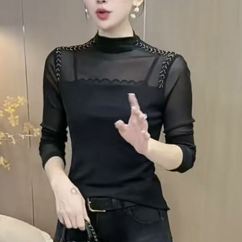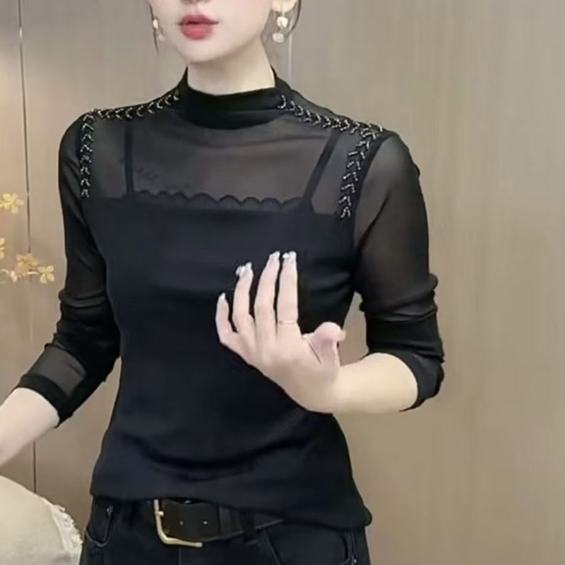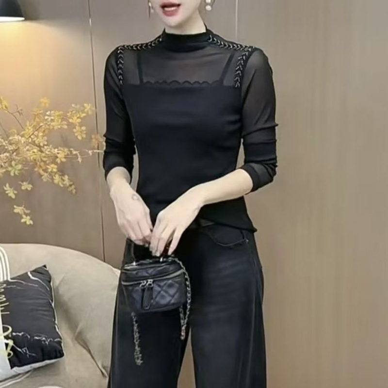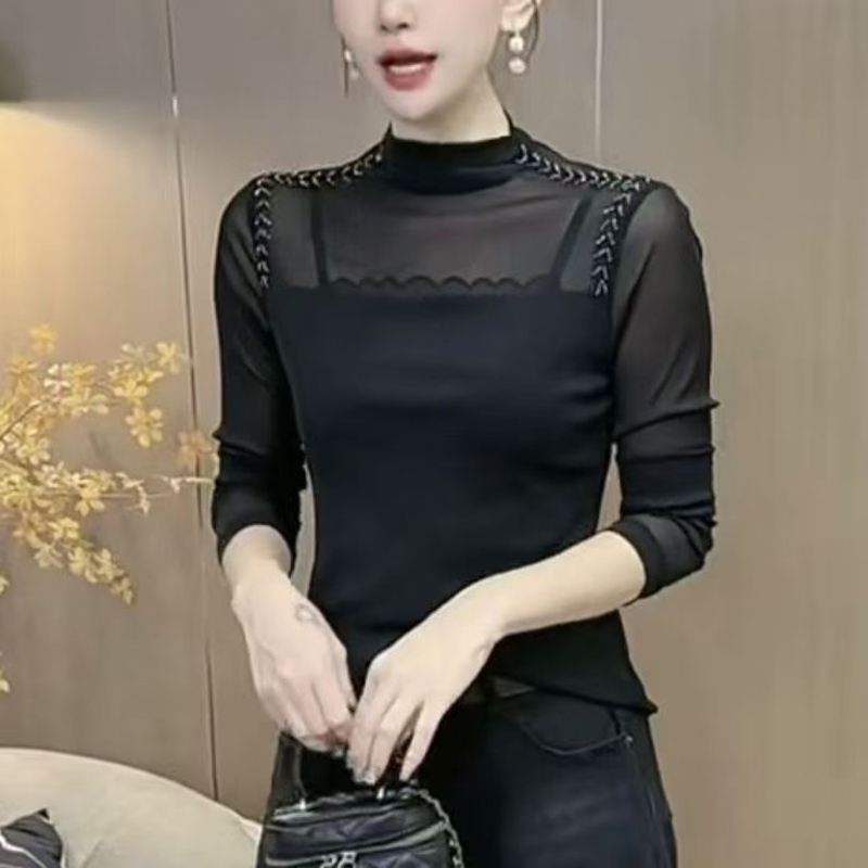 YF6071-图片色韩版时尚网纱编织拼接透视圆领弹力紧身高级感蕾丝上衣