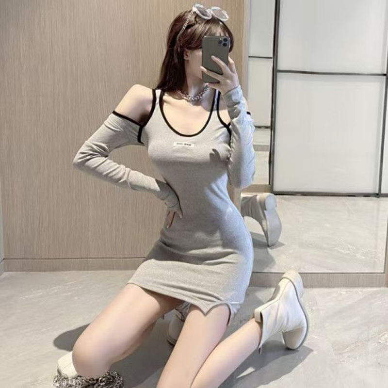 YF6074-(3色入内)性感辣妹镂空长袖吊带拼接假两件修腰包臀紧身连衣裙