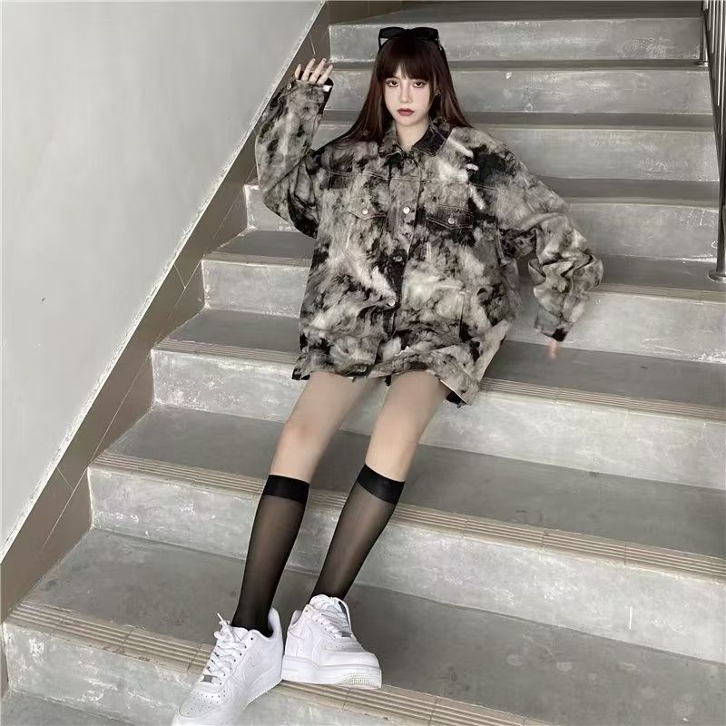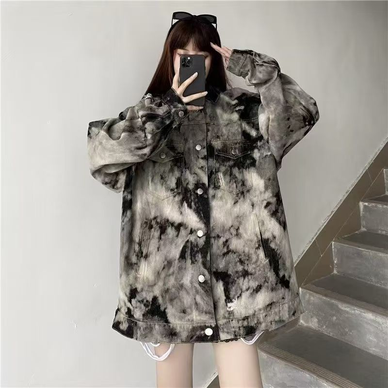 YF6075-图片色复古扎染洗水做旧小众设计慵懒风长袖POLO领大码牛仔上衣