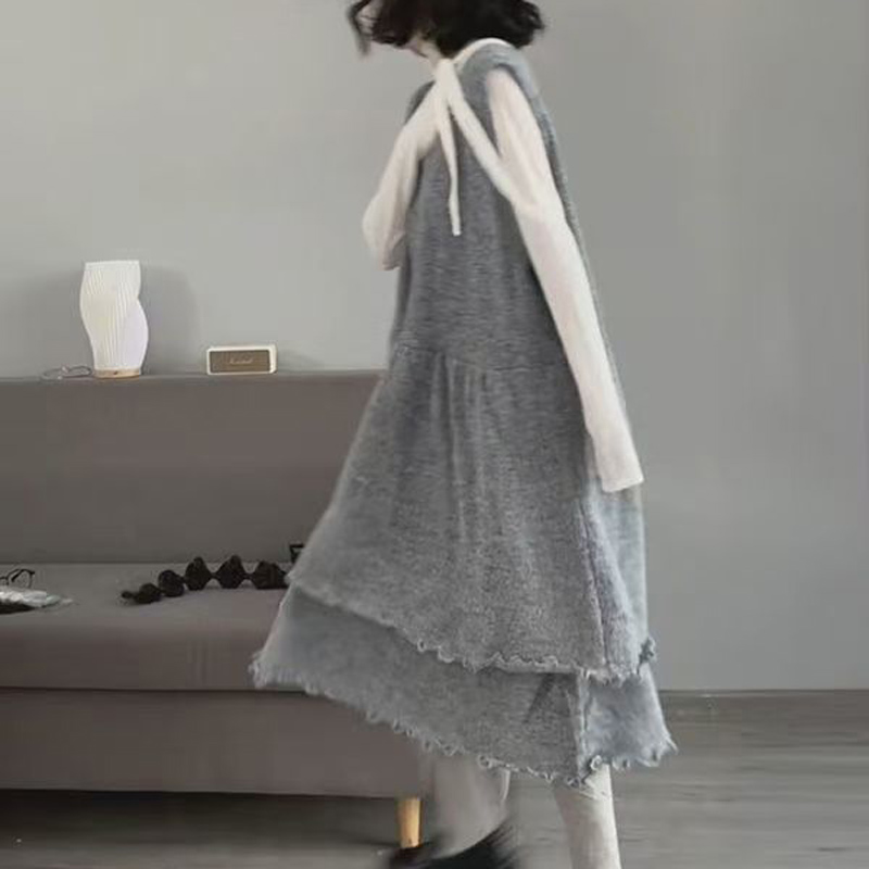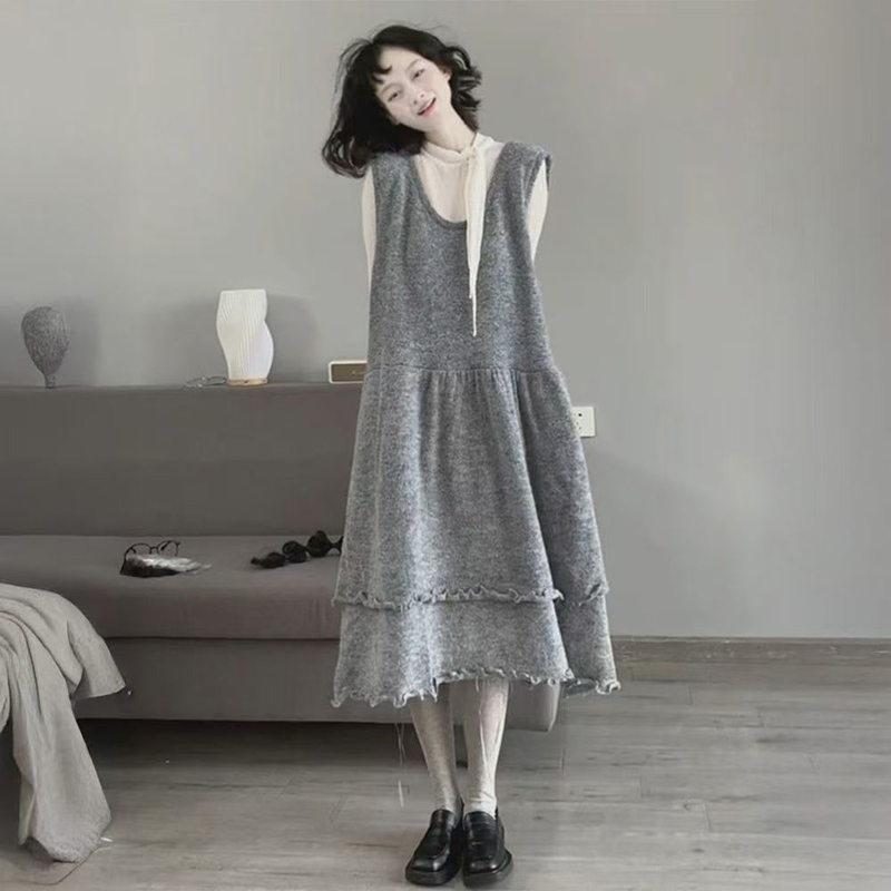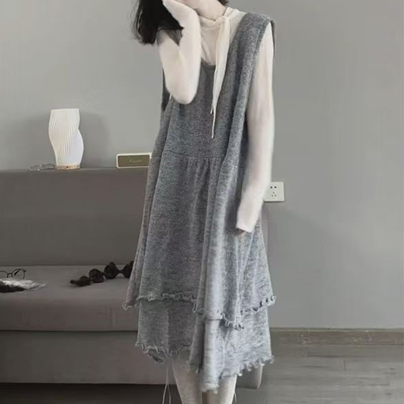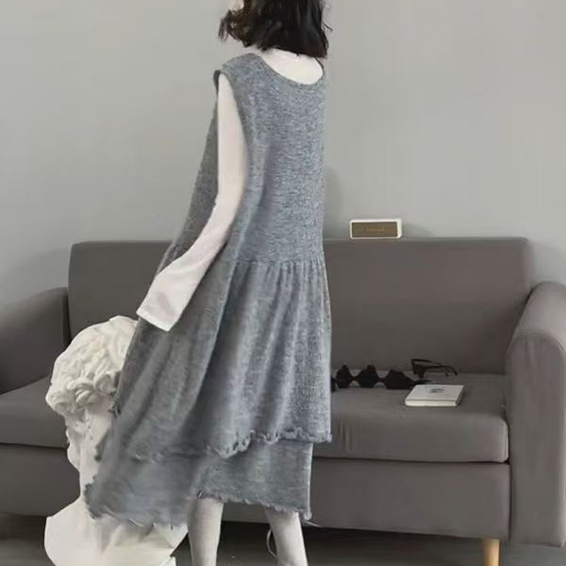 YF6078-图片色时尚法式无袖不规则开叉弧边A字褶折宽松大码背心连衣裙