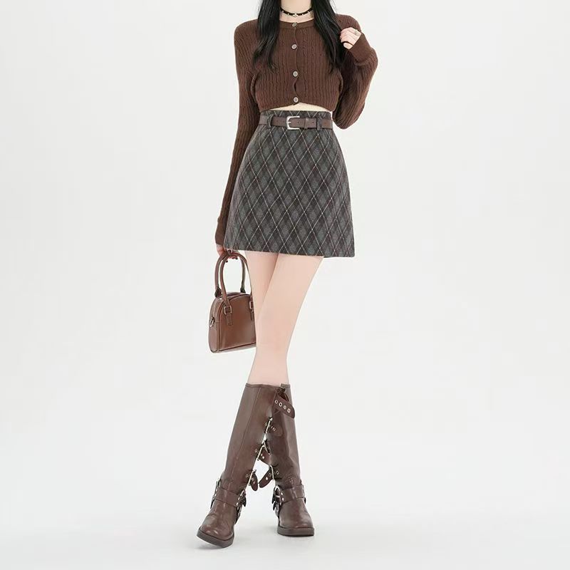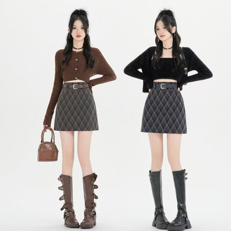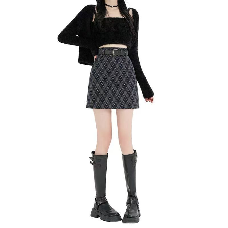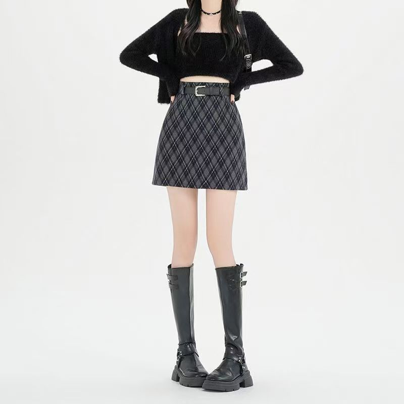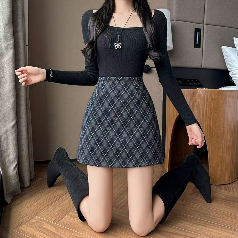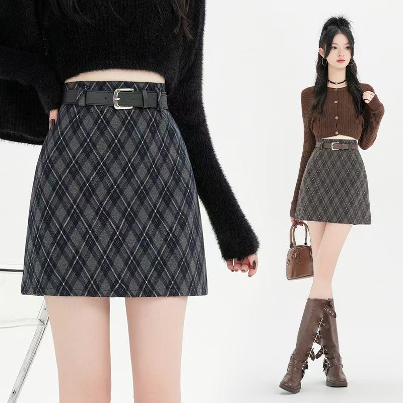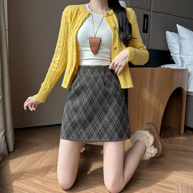 YF6081-(3色入内)秋冬毛呢新款高腰A字菱形提花编织显高防走光内衬半身