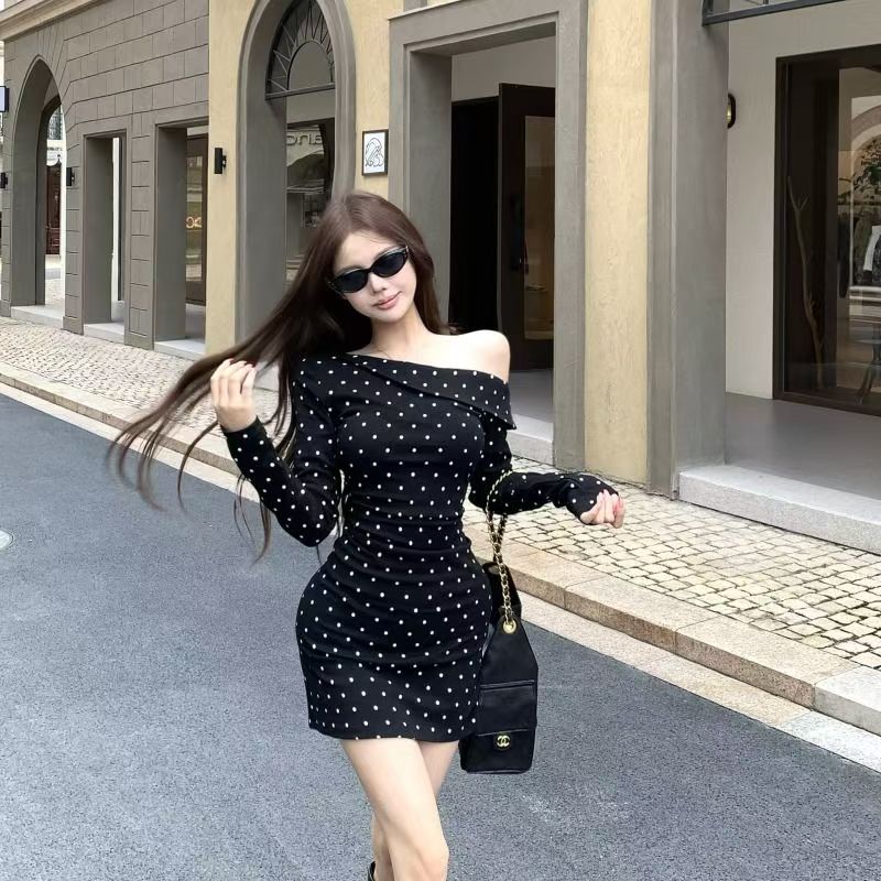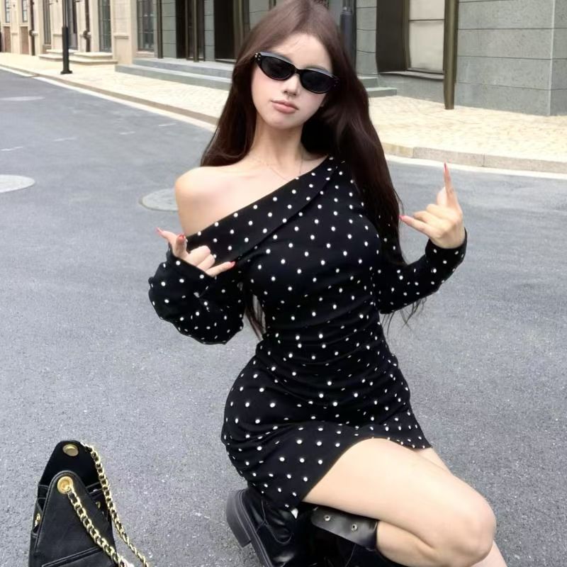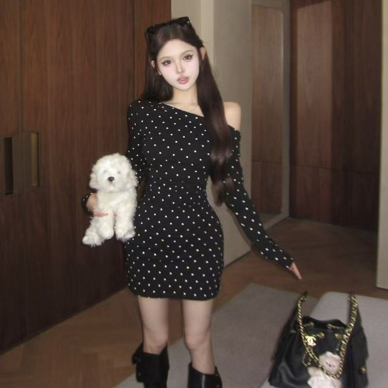 YF6085-图片色性感小可爱波点露肩长袖弹力修腰包臀显瘦春秋百搭连衣裙