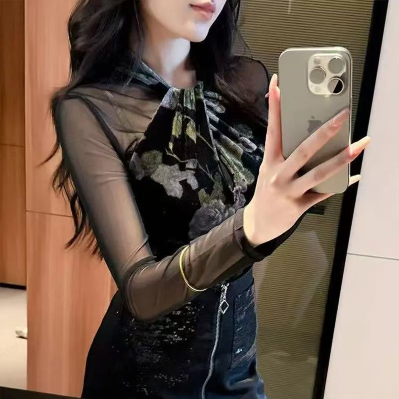 YF6091-(2色入内)春秋名媛风提花丝绒网纱拼接复古风长袖系领设计上衣