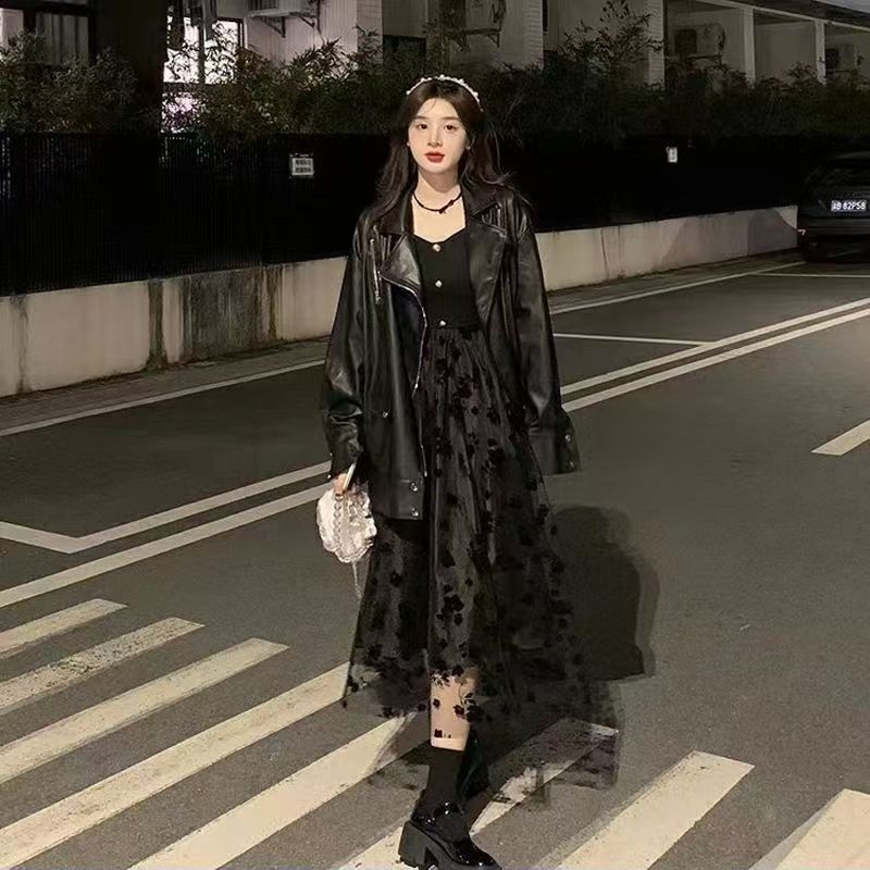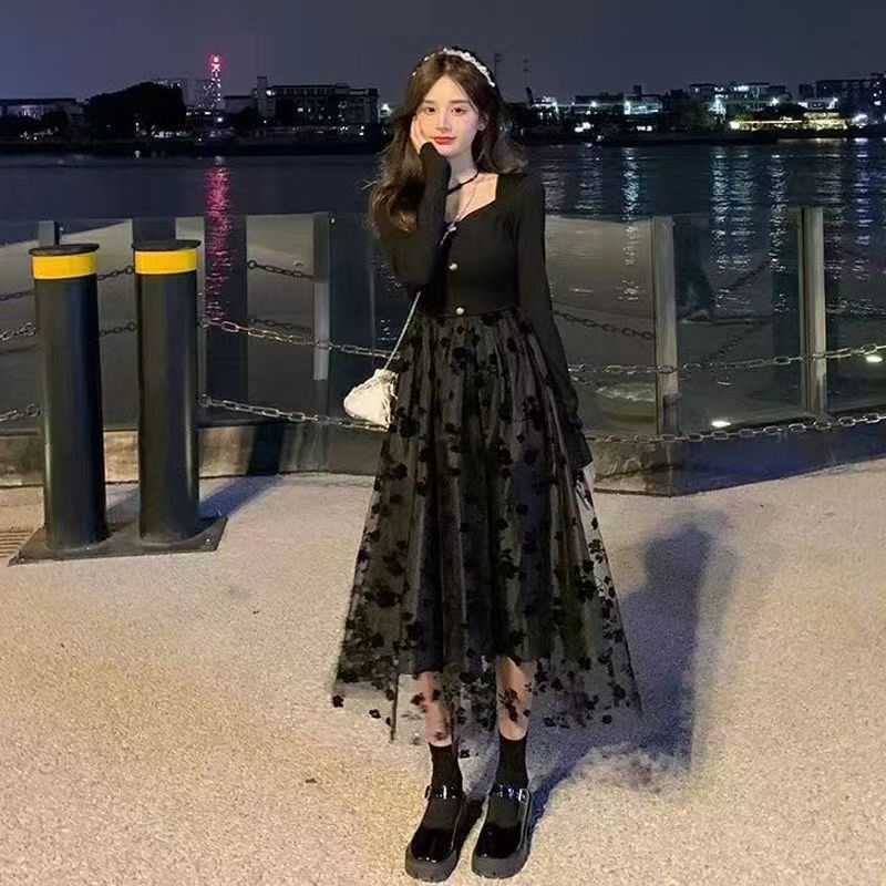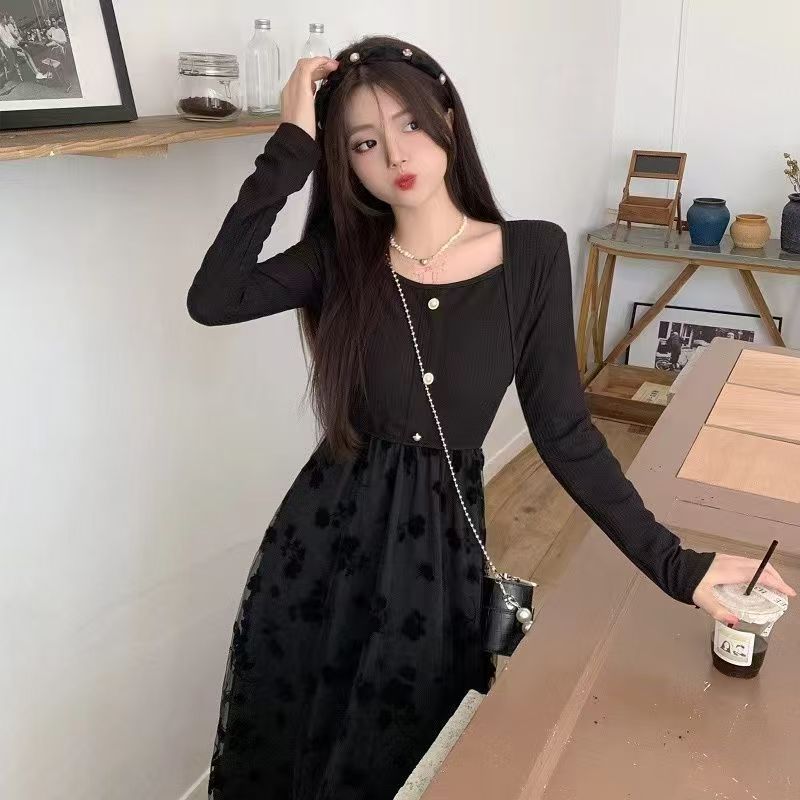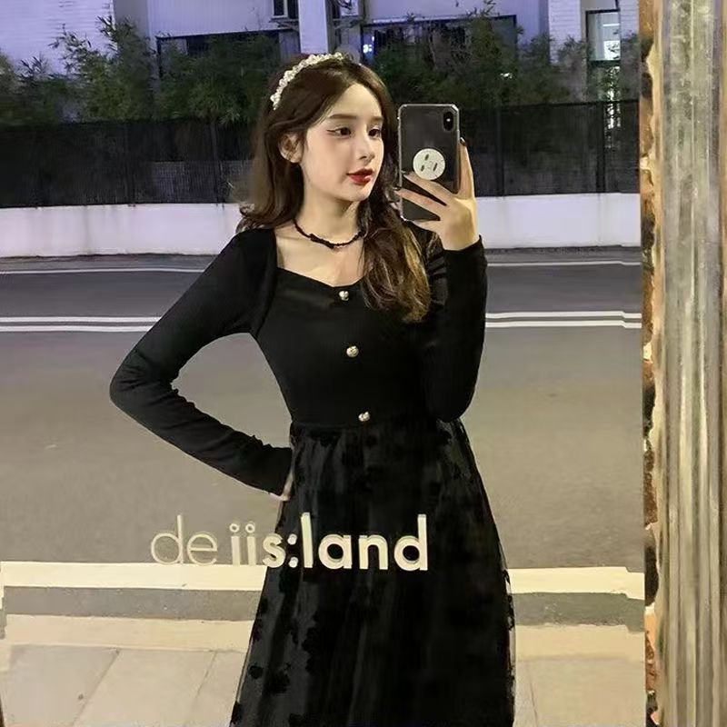 YF6094-图片色甜美时尚赫本风长袖套头排扣拼接网纱复古气质黑色连衣裙