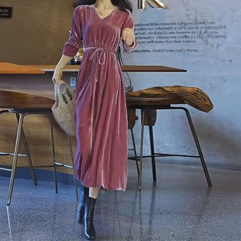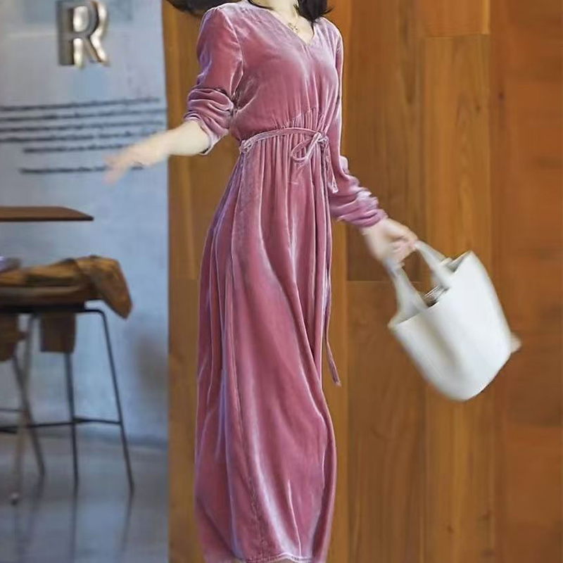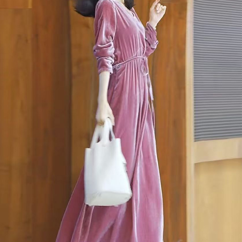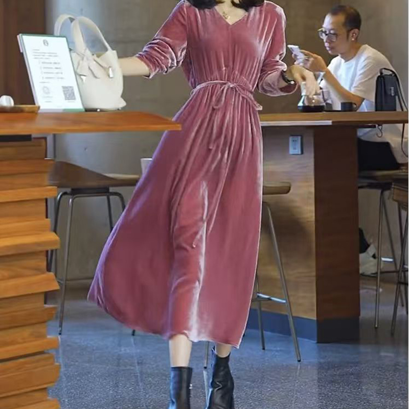YF6095-图片色名媛气质金丝绒秋冬保暖长袖V领绑带显瘦中长款连衣裙