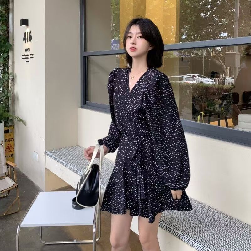 YF6096-图片色小清新泡泡袖V领荷叶边束腰绑绳波点设计大码显瘦雪纺连衣裙