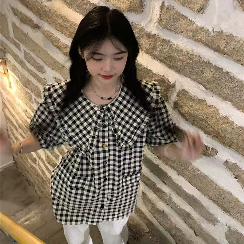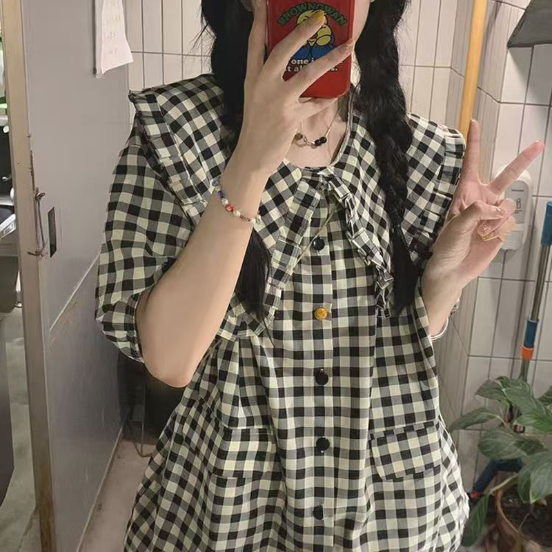 YF6097-图片色复古娃娃装翻领排扣设计短袖宽松大码格子设计气质感上衣