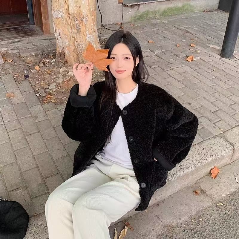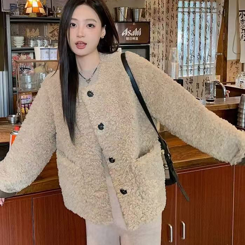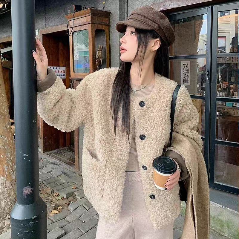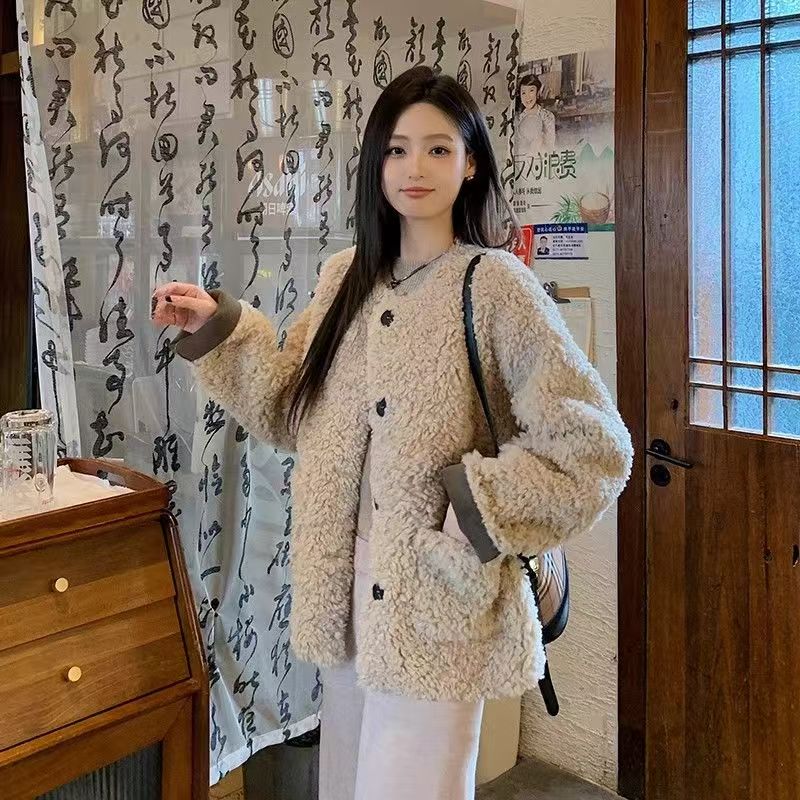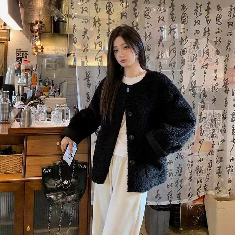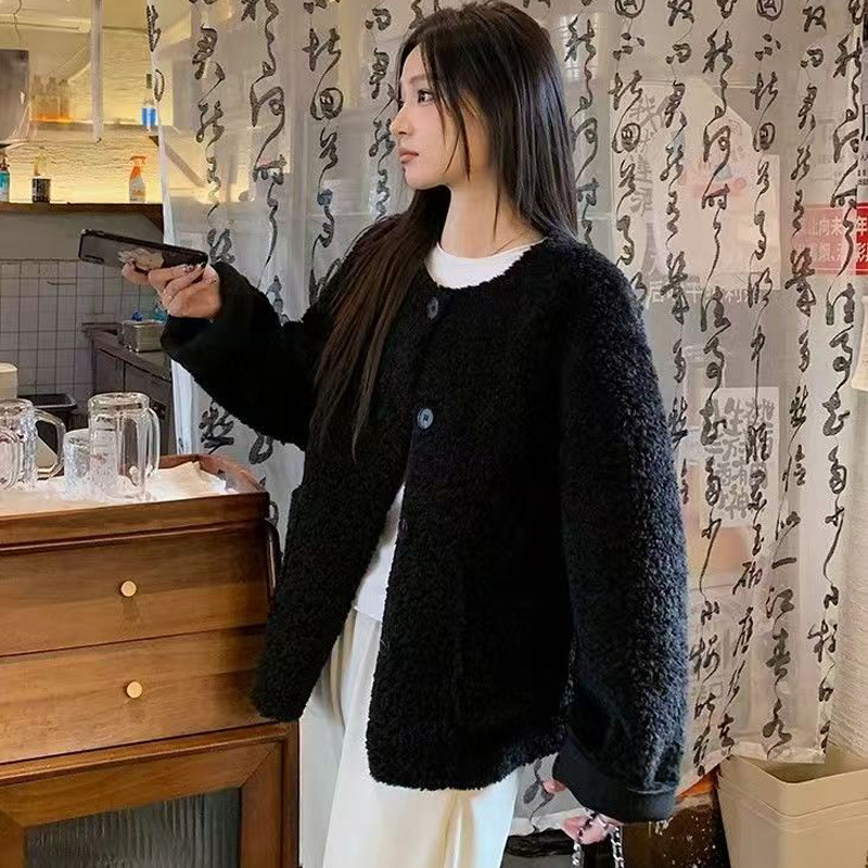 YF6103-(2色入内)秋冬羊羔绒圆领长袖系扣宽松大码慵懒风短款冬装上衣