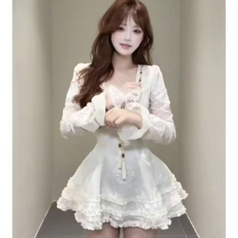 YF6105-图片色名媛公主气质长袖V领花边织带设计提花复古秋冬蕾丝连衣裙