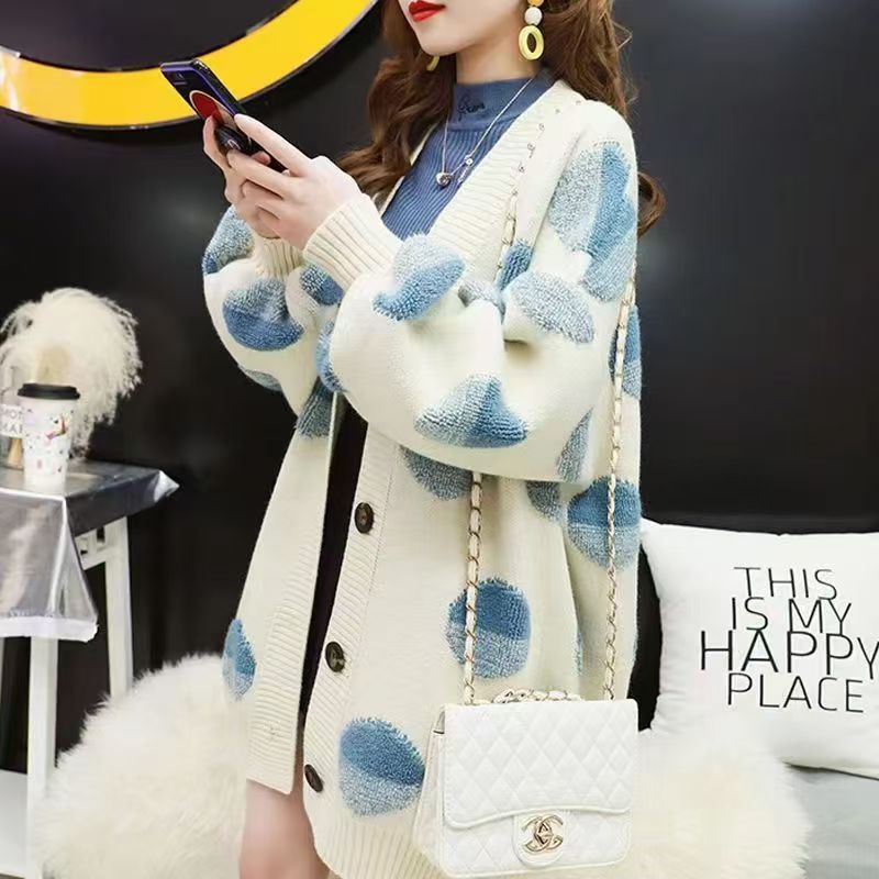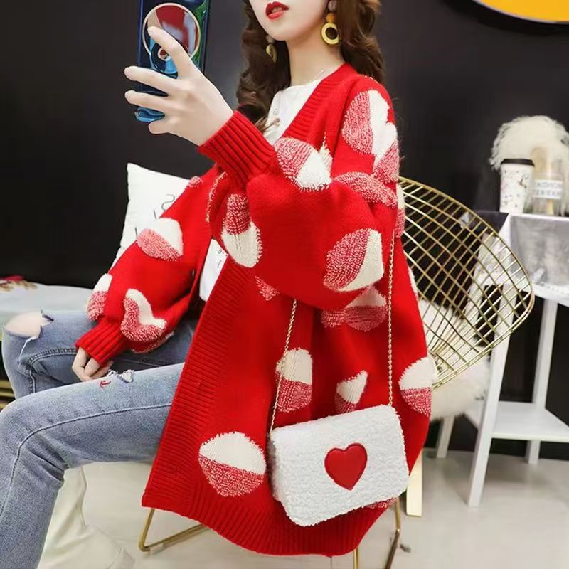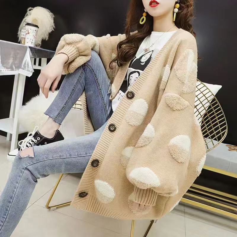 YF6113-(4色入内)慵懒风撞色绒球个性设计长袖开衫加厚大码冬装针织毛衣外套