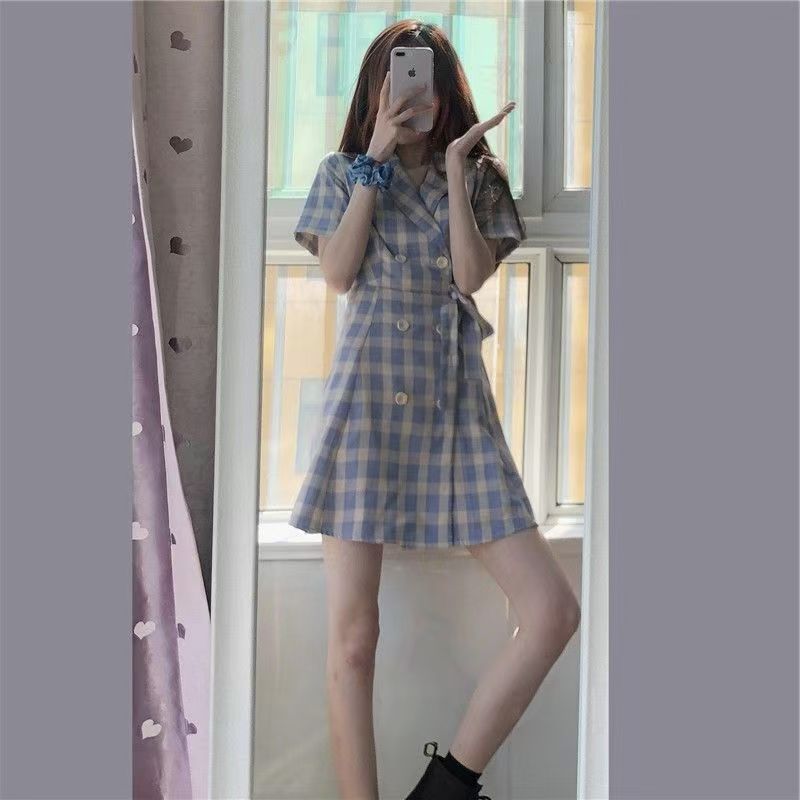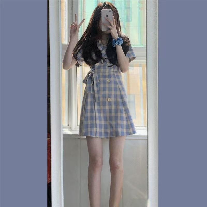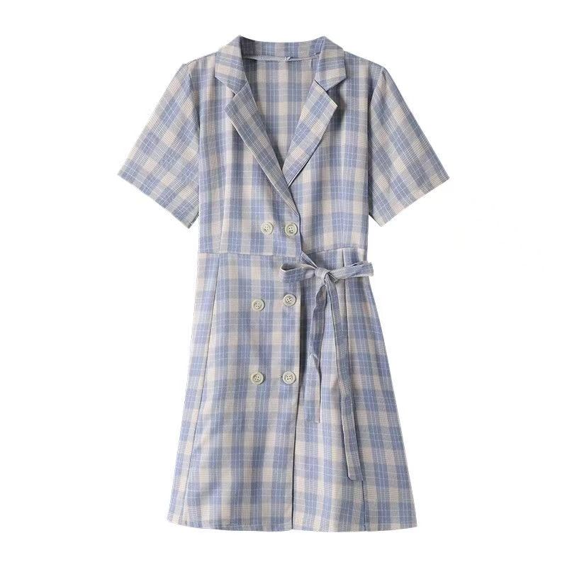 YF6120-图片色韩版格子短袖系腰带翻领夏季收腰显瘦复古气质连衣裙