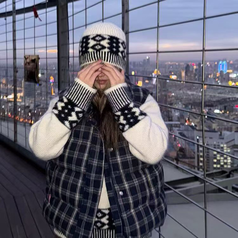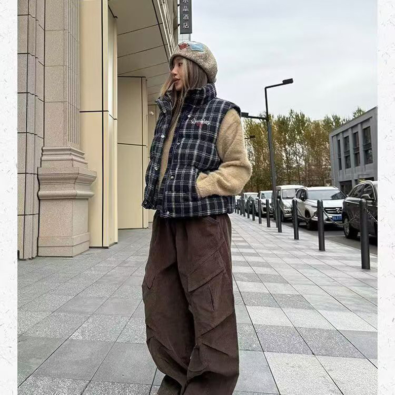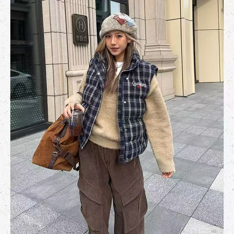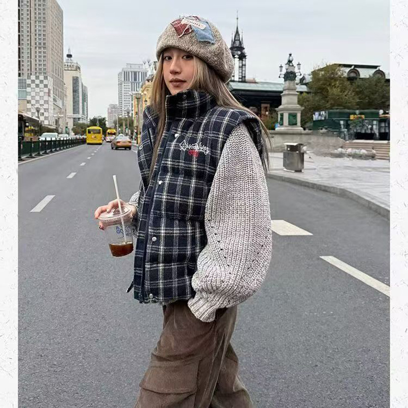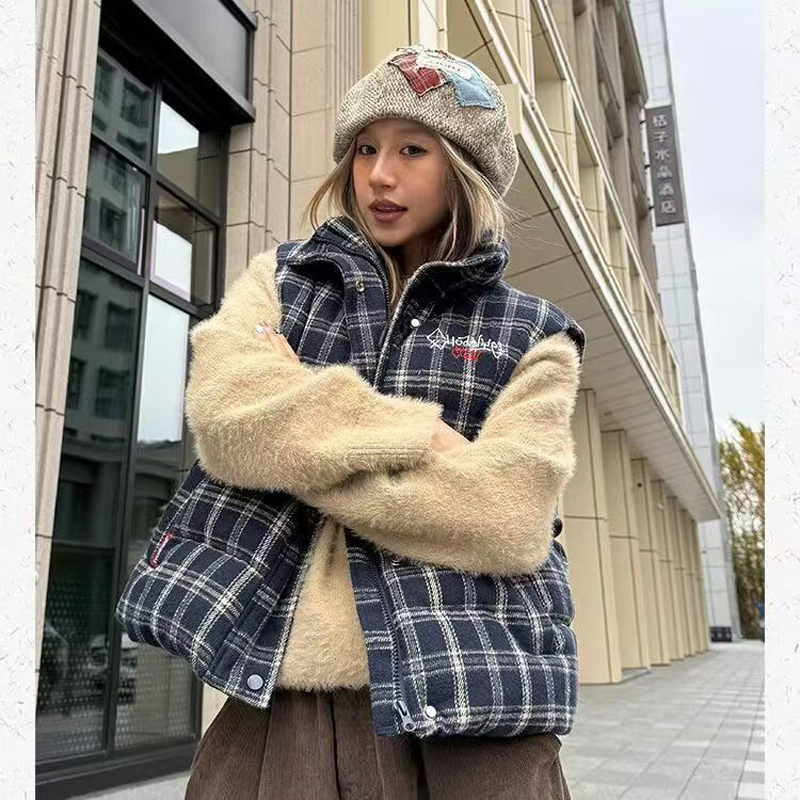 YF6124-图片色冬季无袖拉链字母刺绣复古格子加厚保暖背心 外穿上衣新款