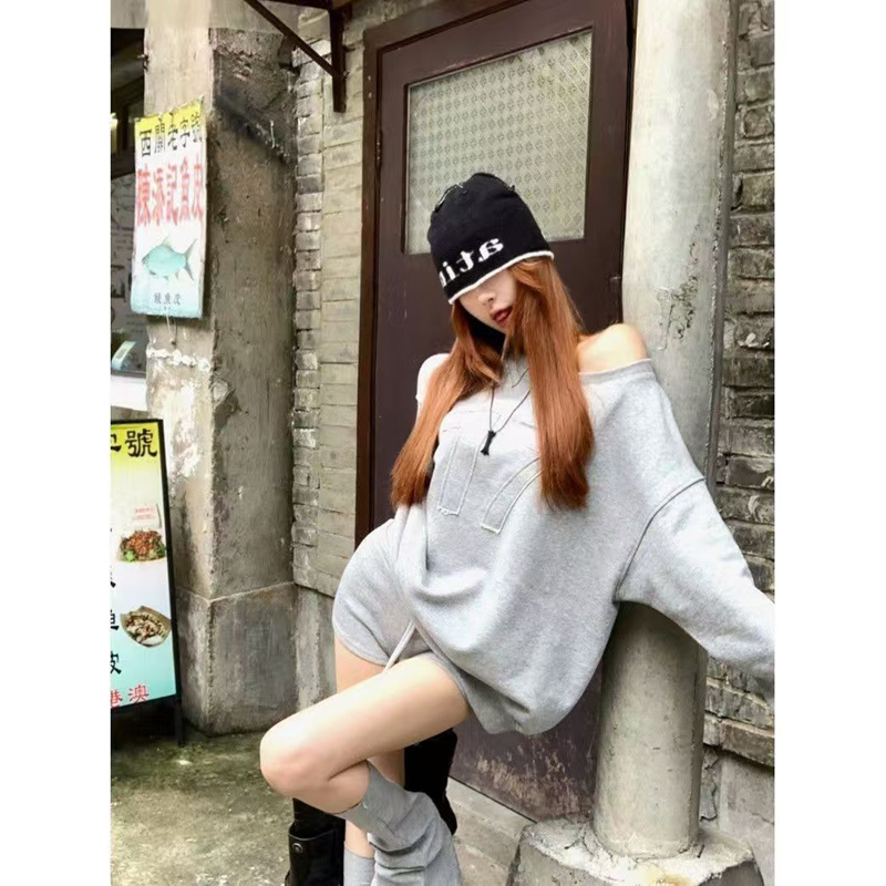 YF6123-(2色入内)韩版长袖连肩套头宽松大码蝙蝠袖设计感休闲显瘦上衣