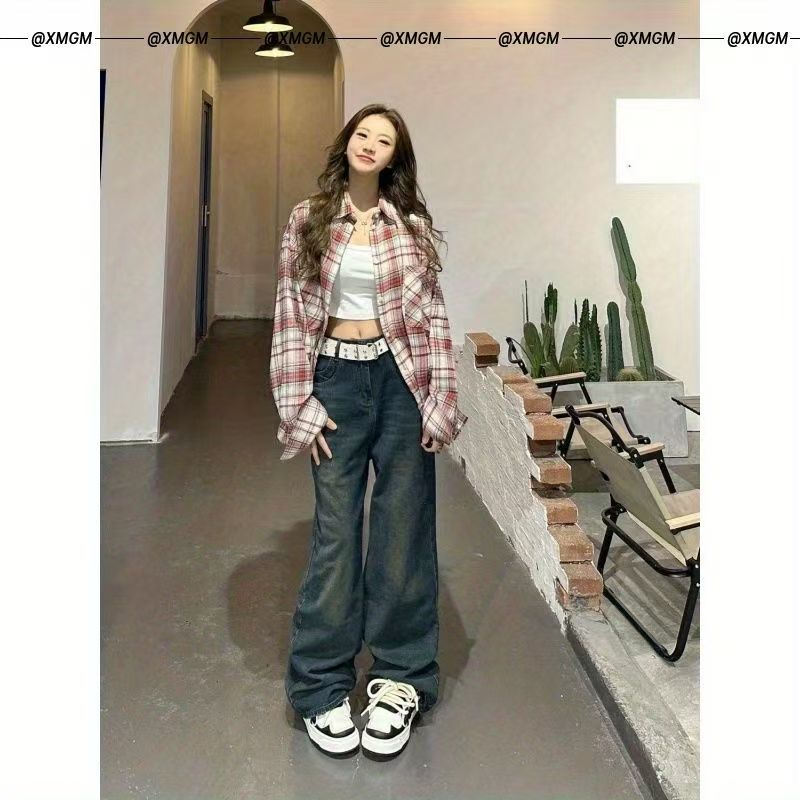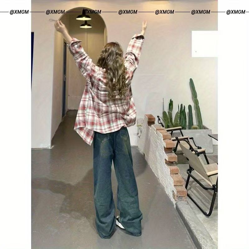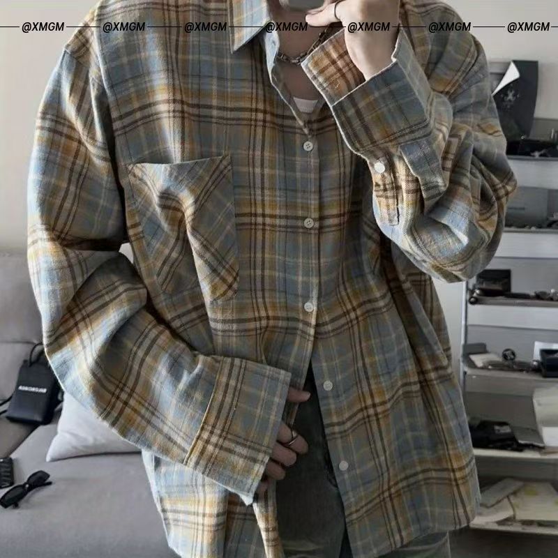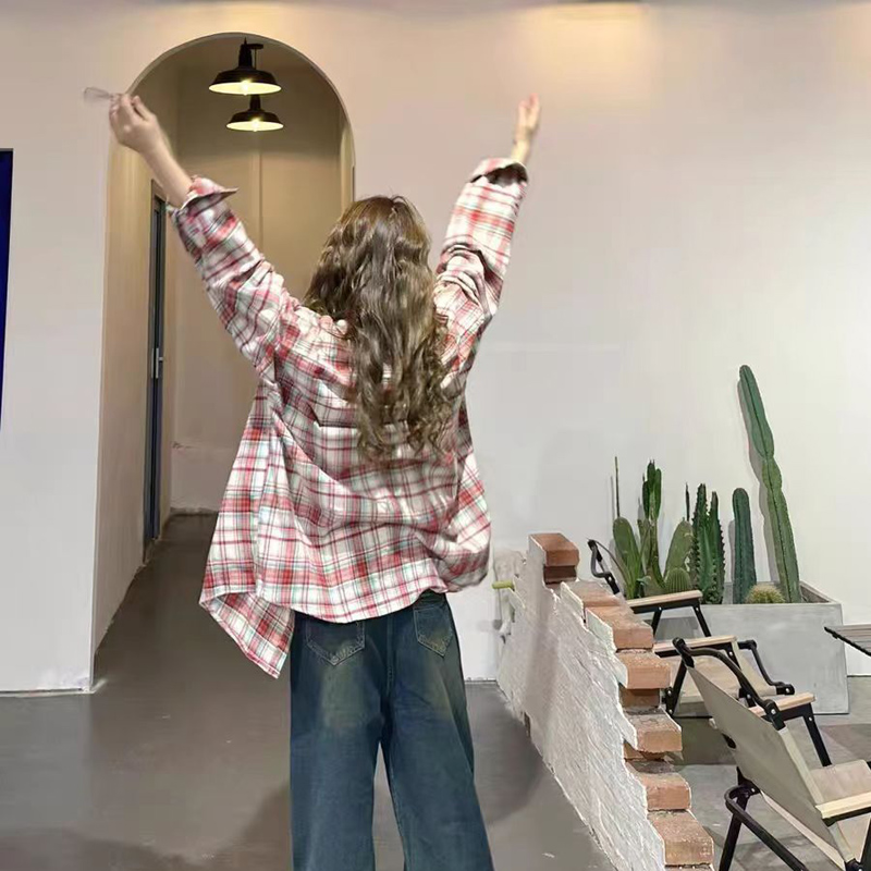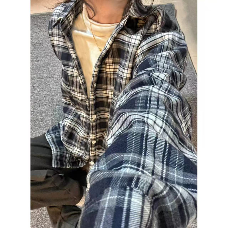 YF6135-(4色入内)慵懒风复古格子衬衣 学院风休闲大码简练百搭上衣