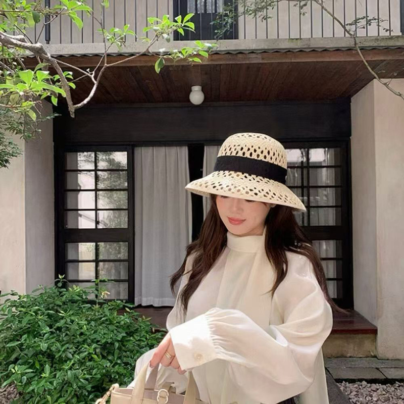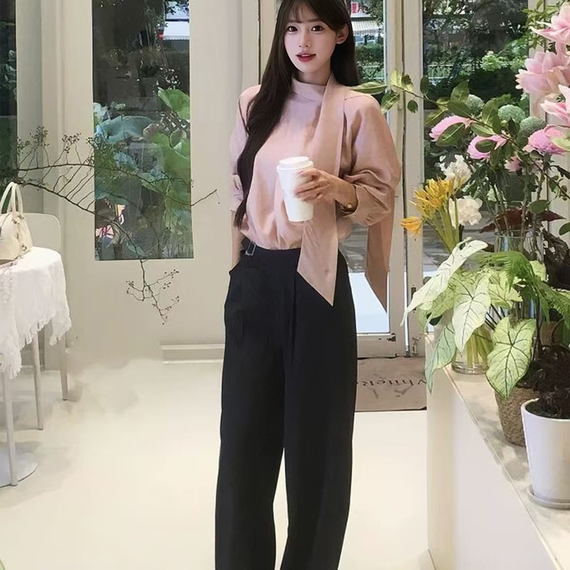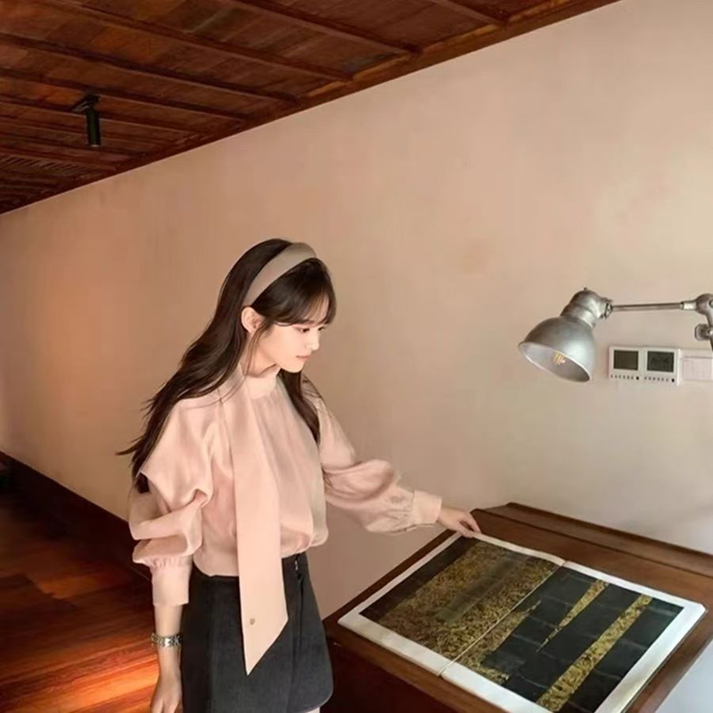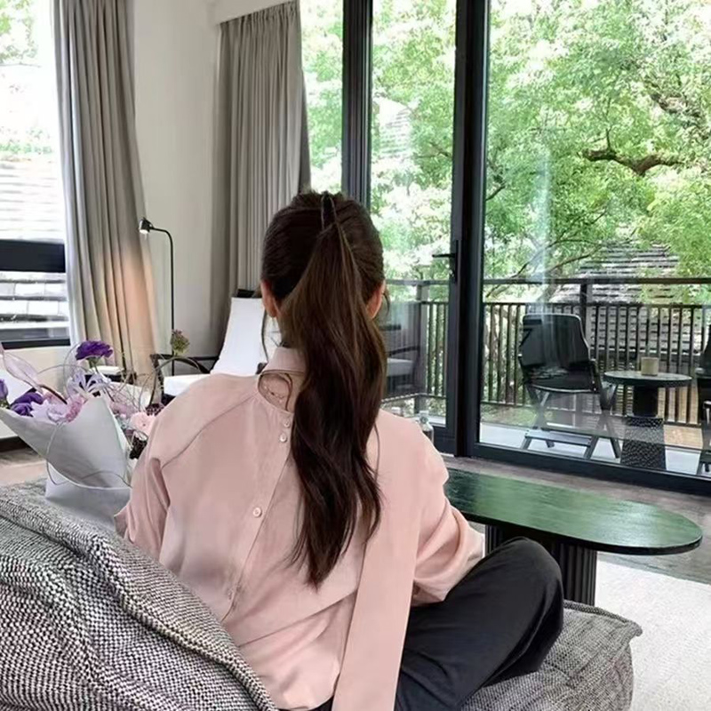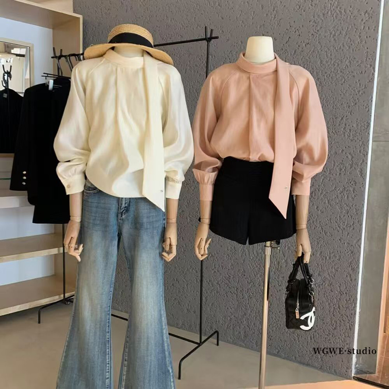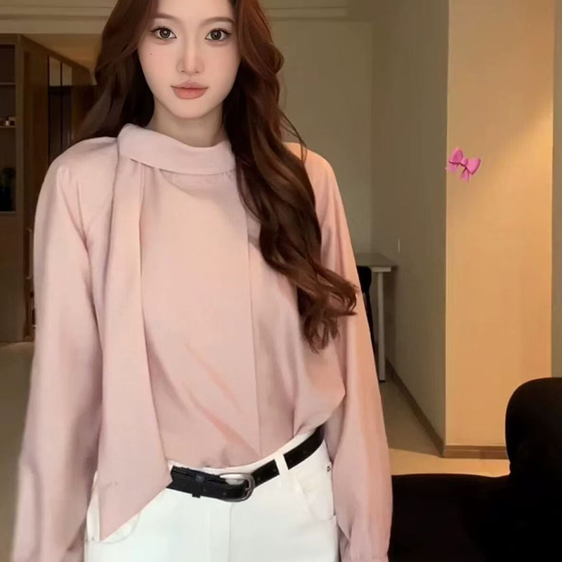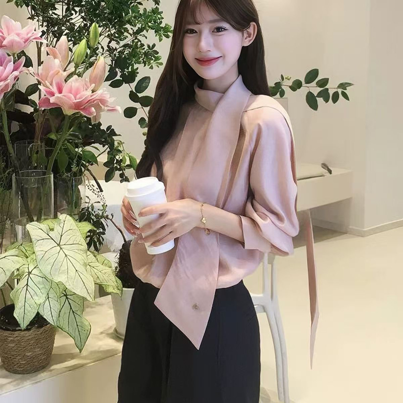 YF6153-(2色入内)甜美时尚后背系扣设计围脖飘带小众宽松大码别致雪纺衫