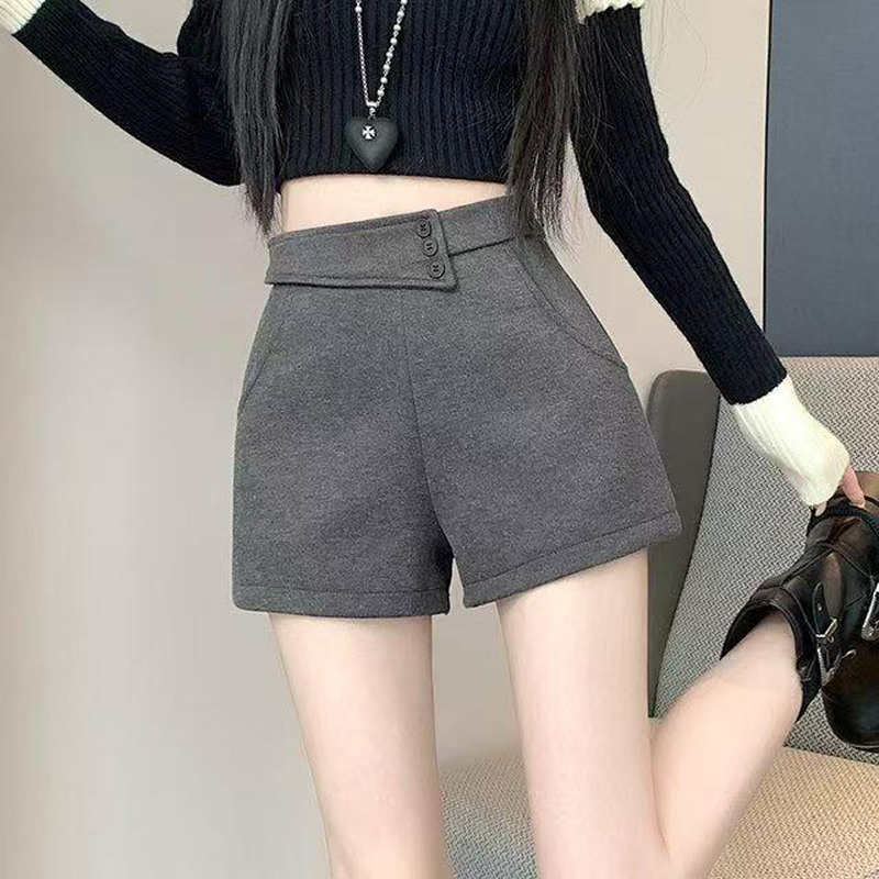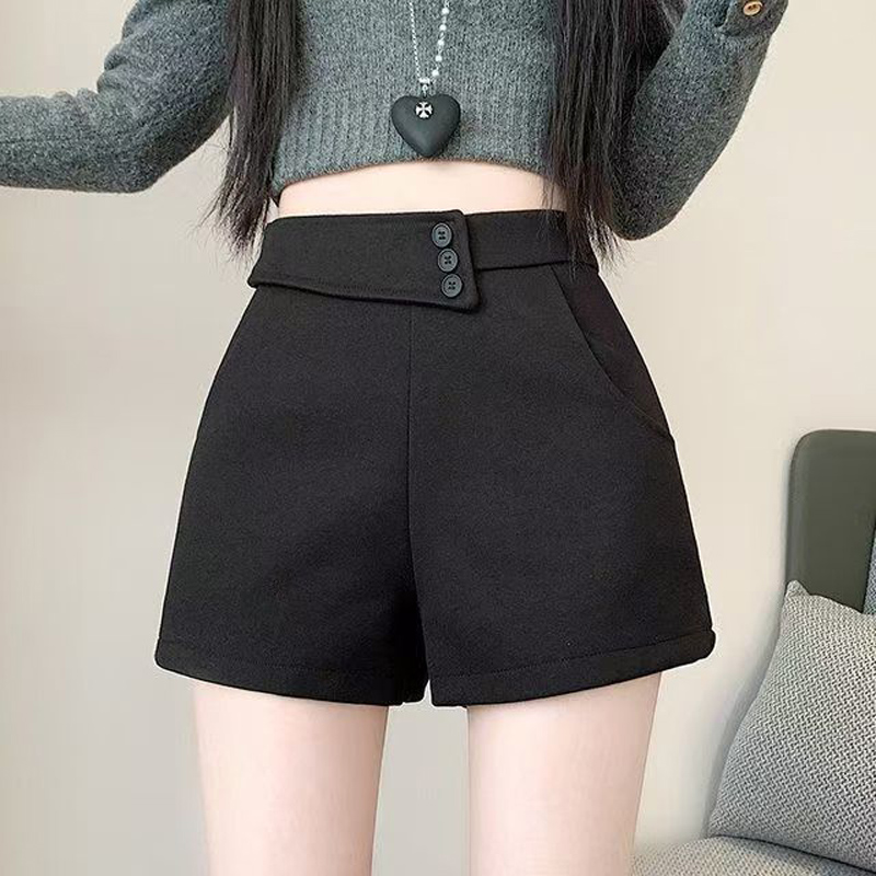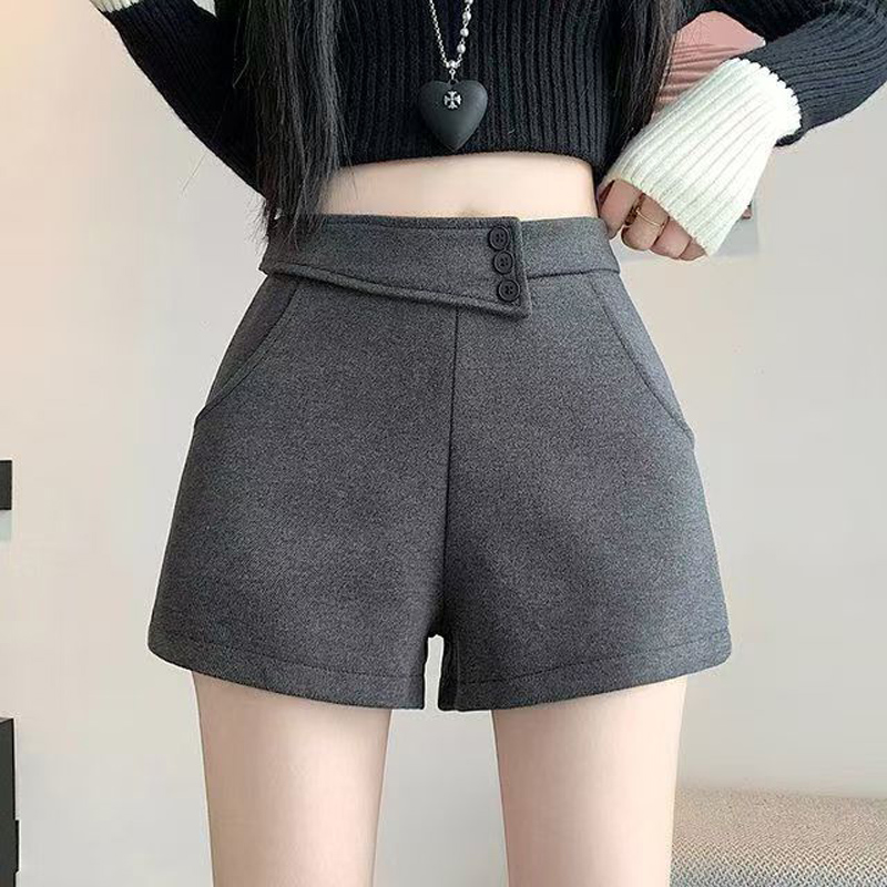 YF6158-(2色入内)冬装不规则排扣A字加厚毛呢阔腿短裤 外穿休闲西裤