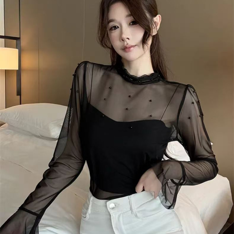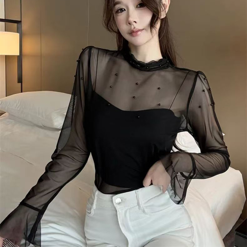 YF6175-(2色入内)秋冬纯欲风钉珠长袖高领弹力假两件轻奢网纱打底衫