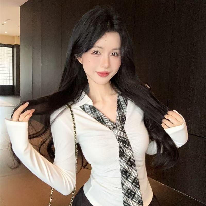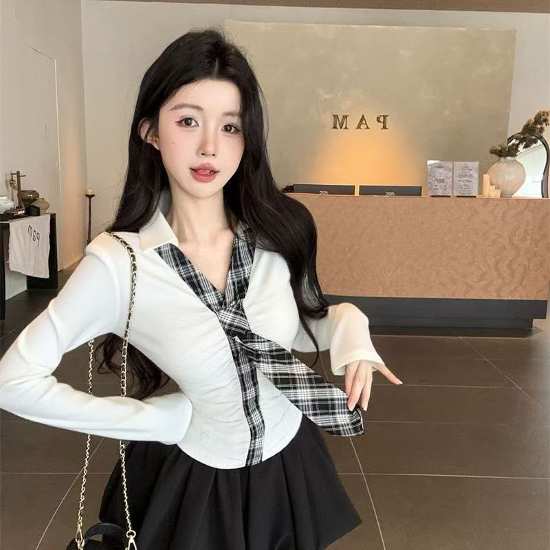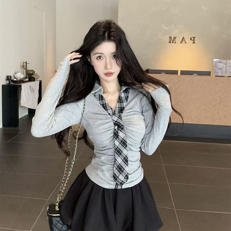 YF6179-(3色入内)甜美小清新领带格子设计长袖POLO领褶折修身上衣