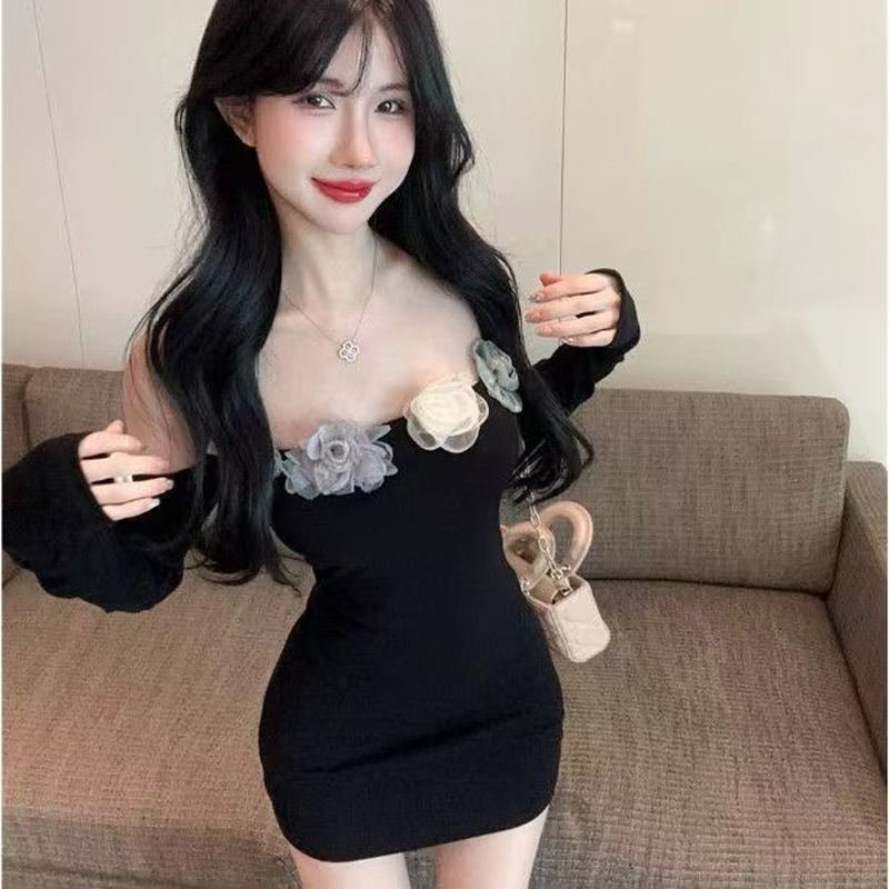 YF6184-图片色性感一字肩撞色玫瑰花设计感长袖弹力修腰包臀纯欲风小礼服