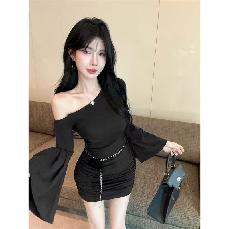 YF6186-(2色入内)带腰链修腰微喇叭露肩长袖套头简约纯色小清新气质连衣裙