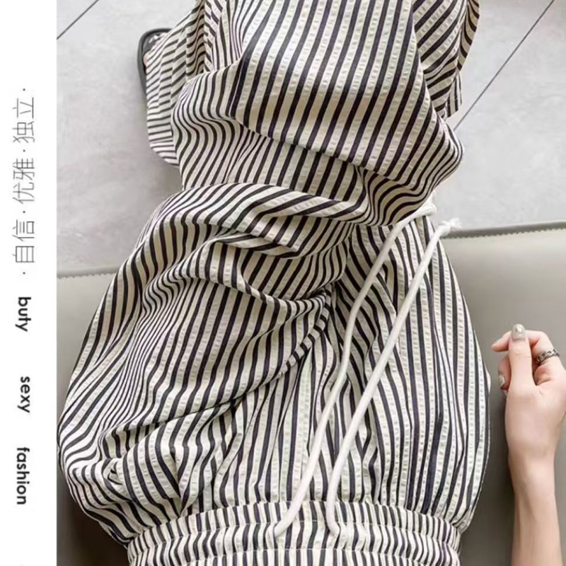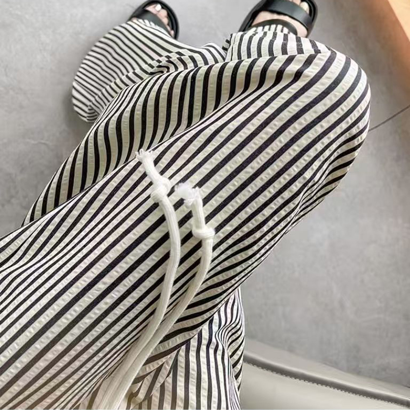 YF6188-(3色入内)港式细条纹抽绳松紧腰直筒坠地感阔脚休闲百搭长裤
