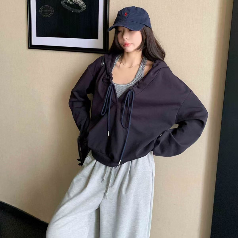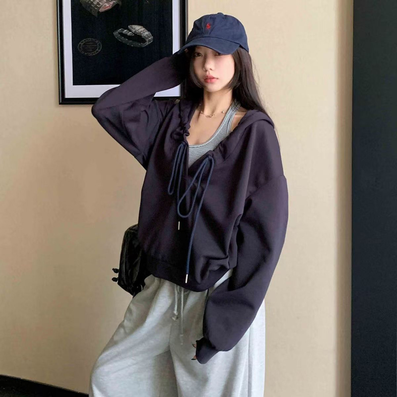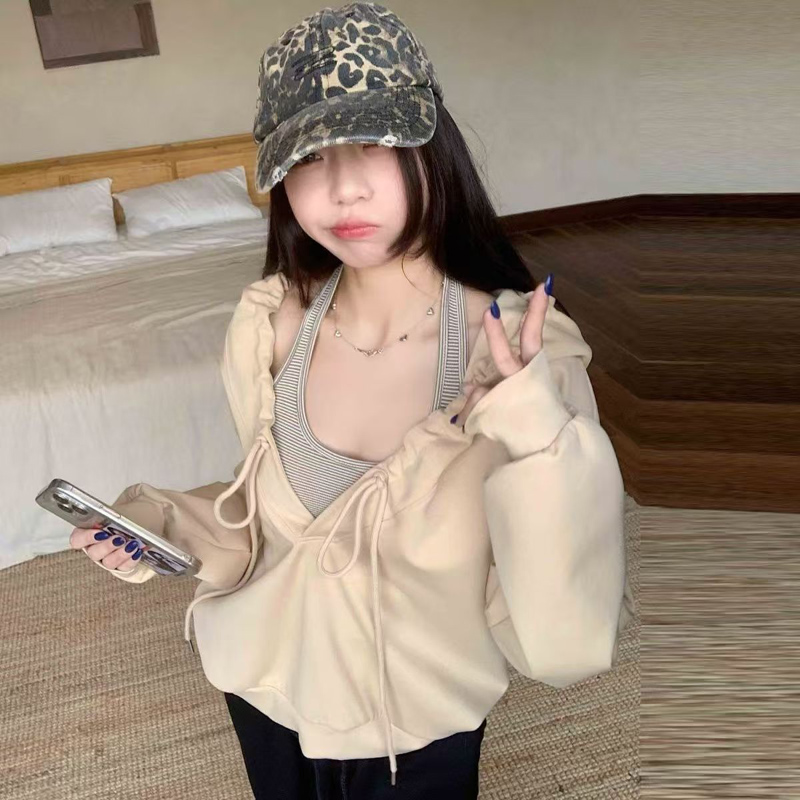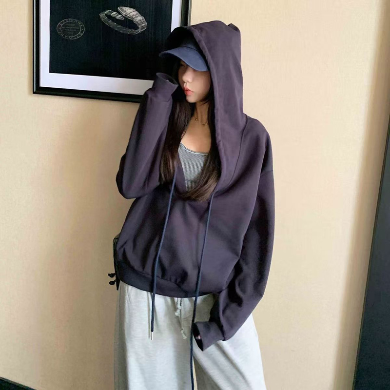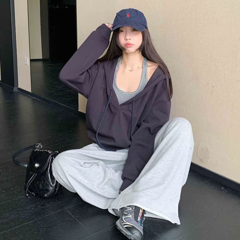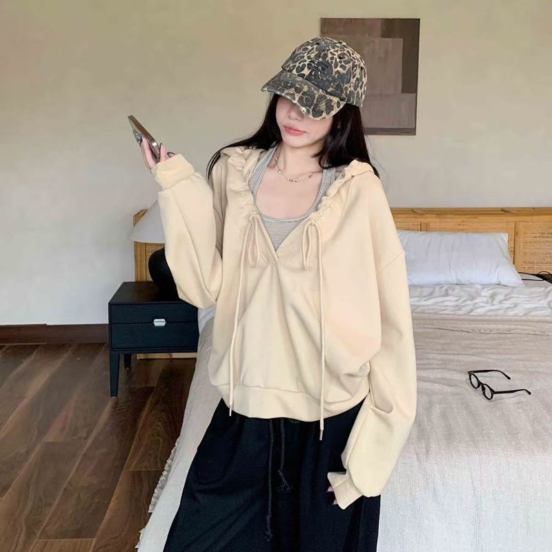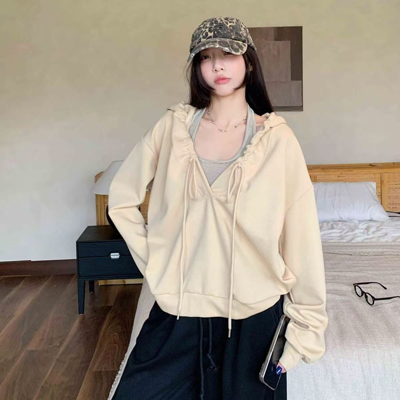 YF6154-图片色慵懒风长袖连帽两穿设计宽松大码一字肩个性美式卫衣