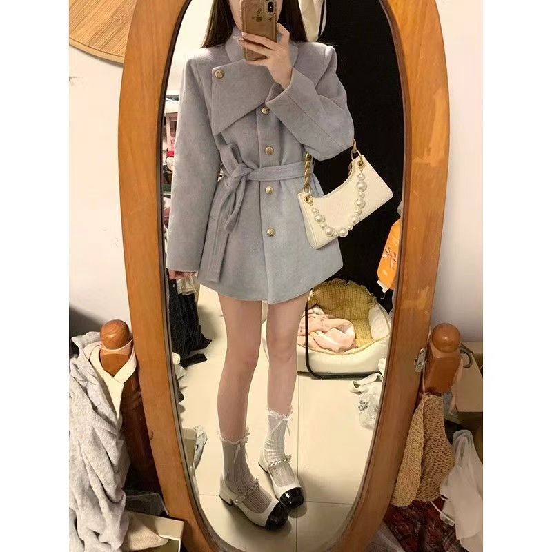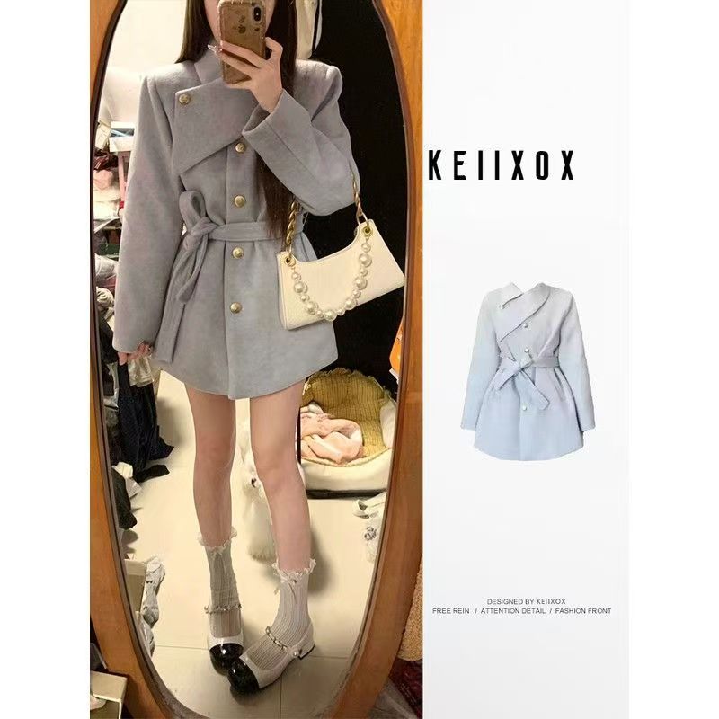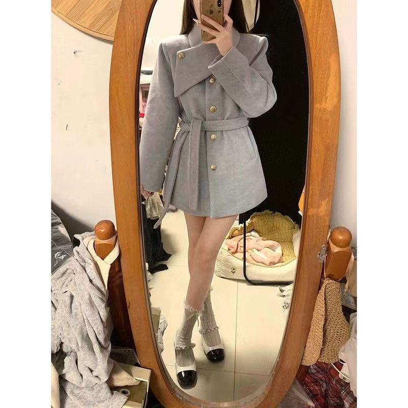 YF6194-图片色日系秋冬新款长袖不规则叠领排扣束带修腰高级感毛呢大衣