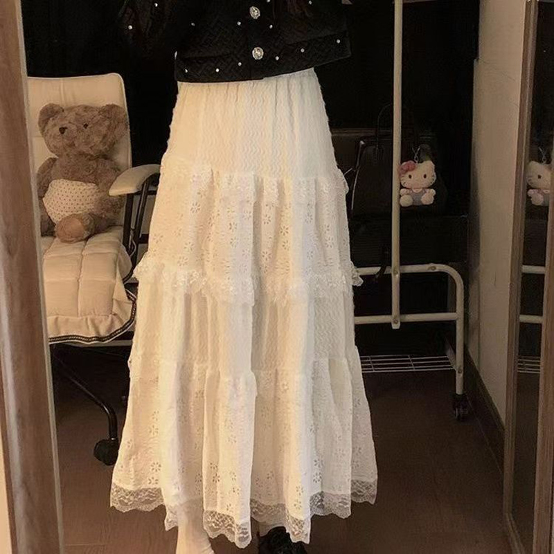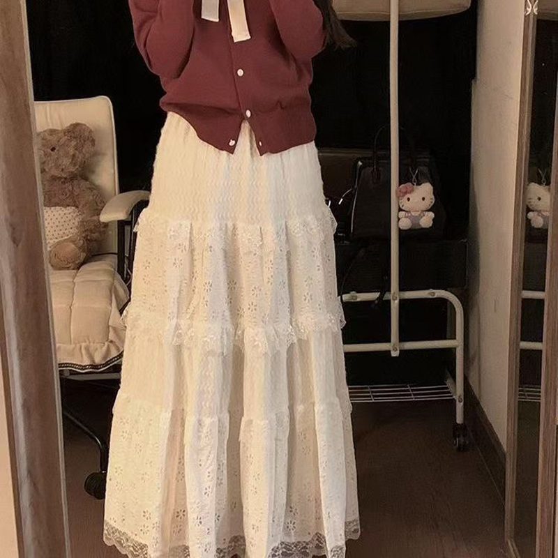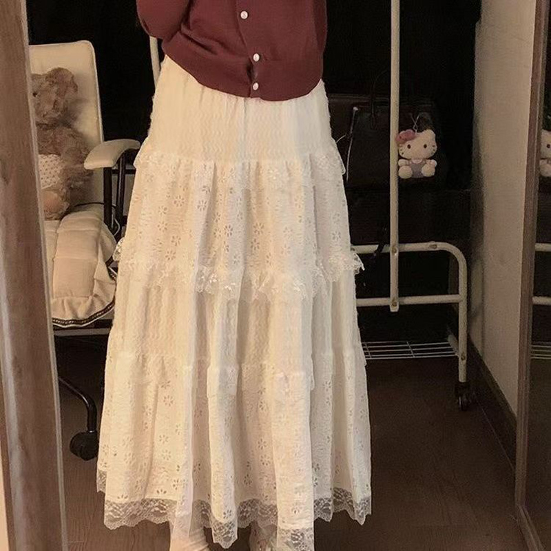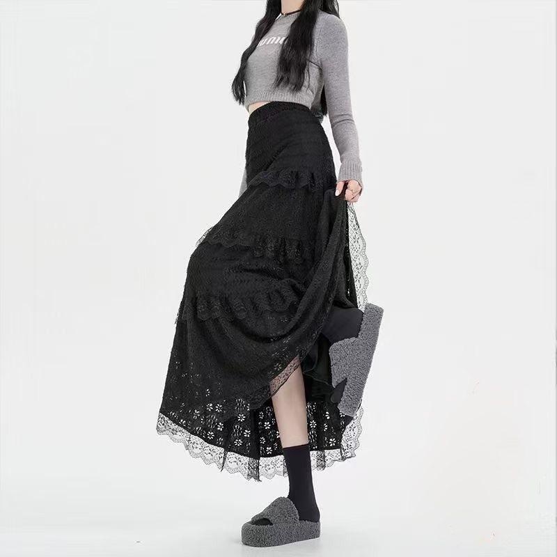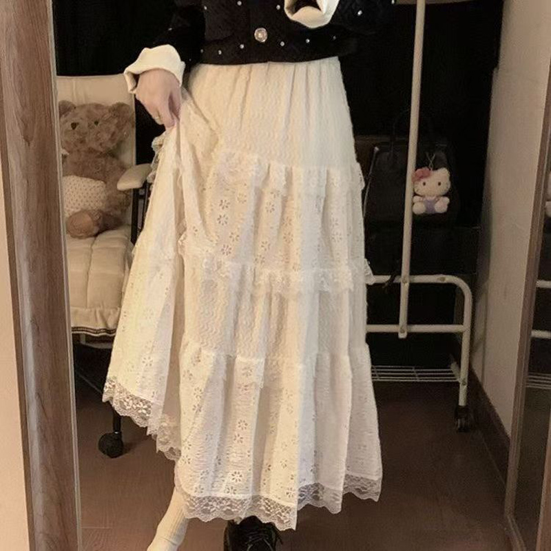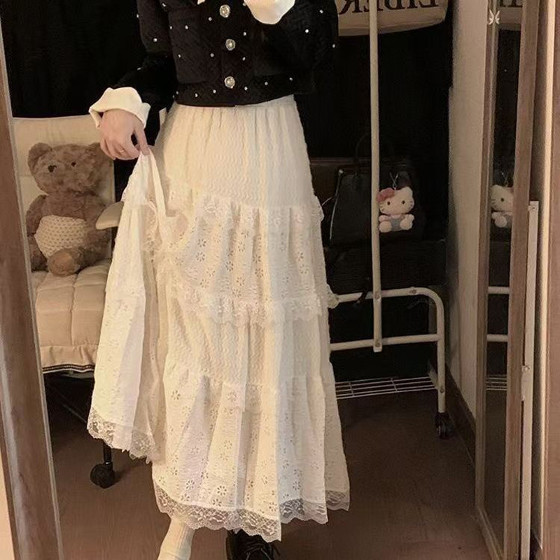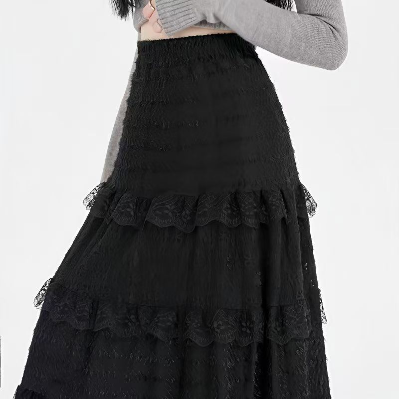 YF6197-(2色入内)加绒秋冬松紧腰A字花边拼接中长款蛋糕款蓬蓬蕾丝半身