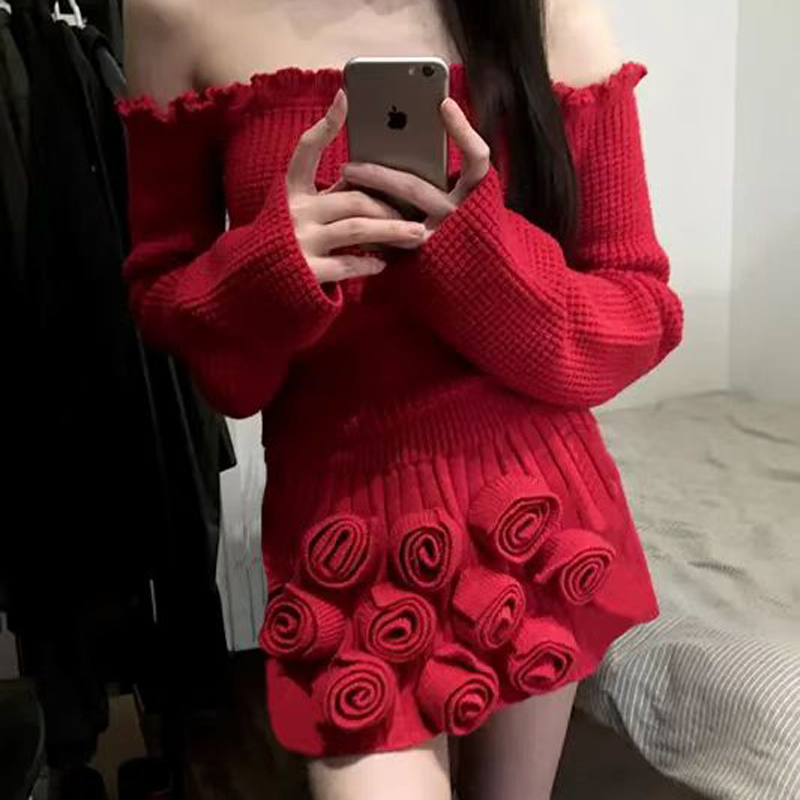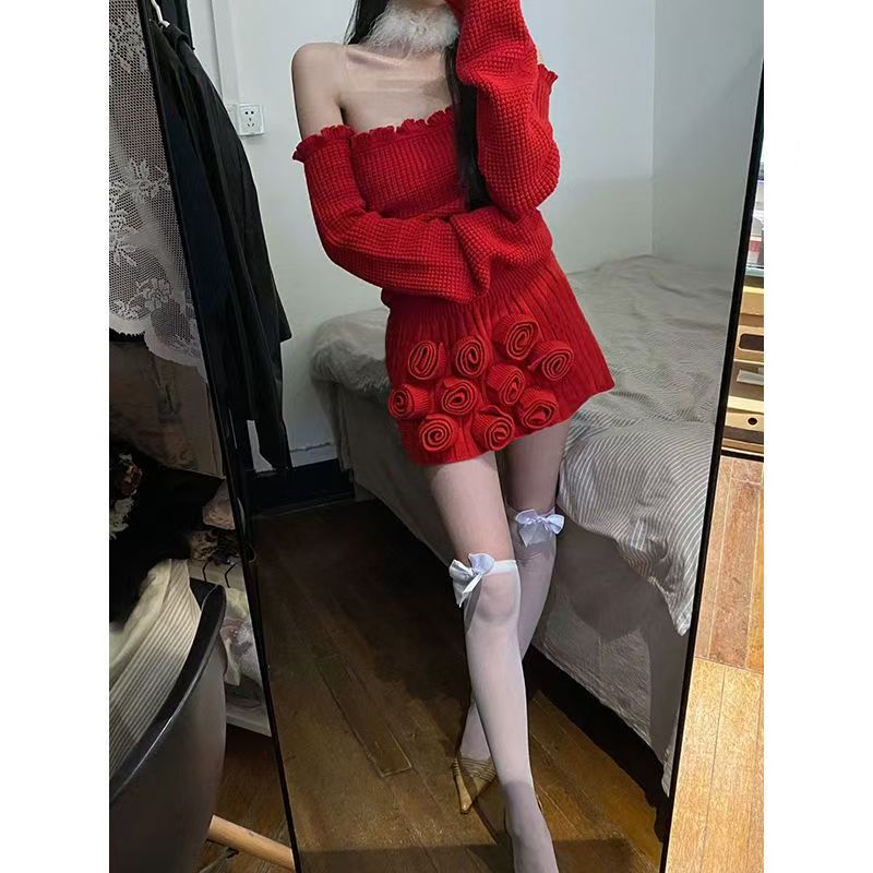 YF6198-图片色一字肩分离长袖露肩抹胸上衣搭松紧腰玫瑰花朵包臀短裙套装