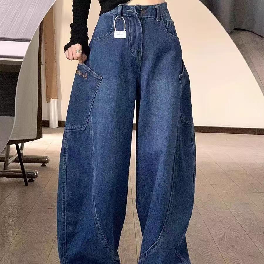 YF6209-(2色入内)字母刺绣弯刀拼接系扣高腰阔腿慵懒风复古蓝休闲牛仔裤