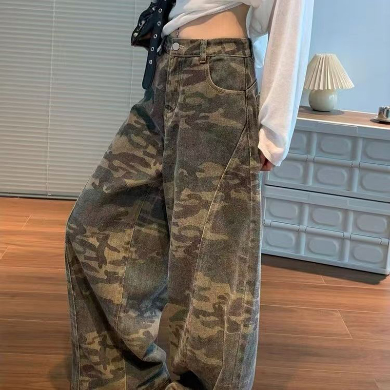 YF6215-图片色弯刀拼接设计慵懒风系扣高腰阔腿迷彩小众潮爆牛仔裤