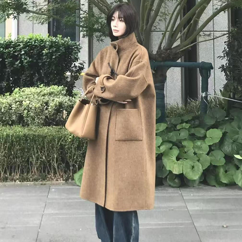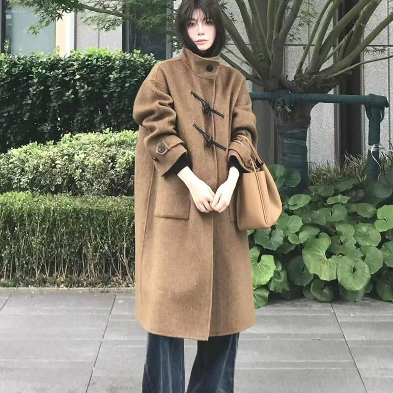 YF6226-图片色韩版冬装长袖立领牛角扣立领中长款驼色加厚毛呢大衣外套