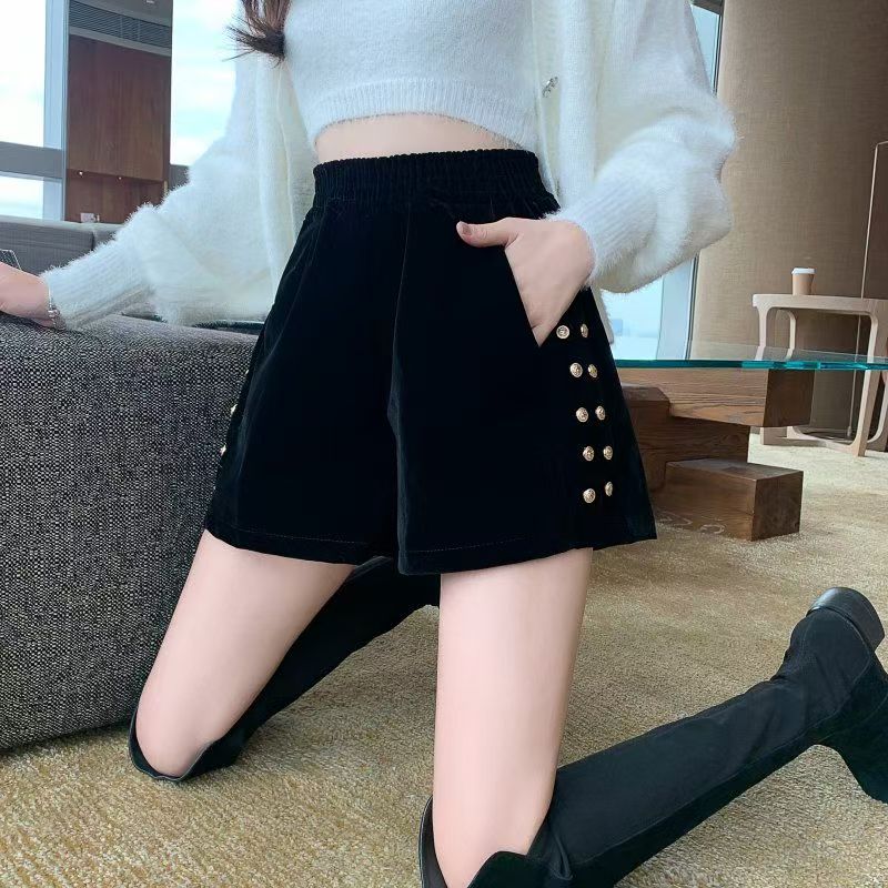 YF6228-图片色冬季时尚保暖金丝绒侧铆钉排扣收腹高腰A字阔腿短裤