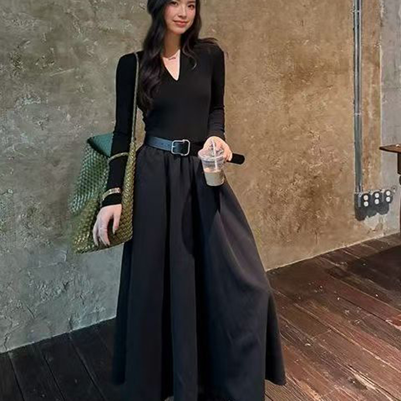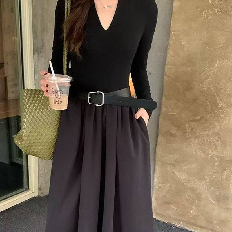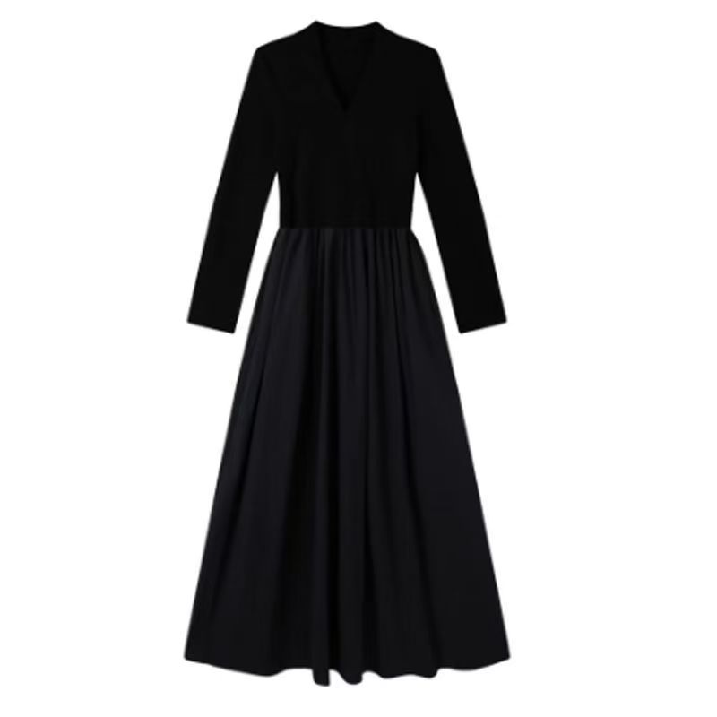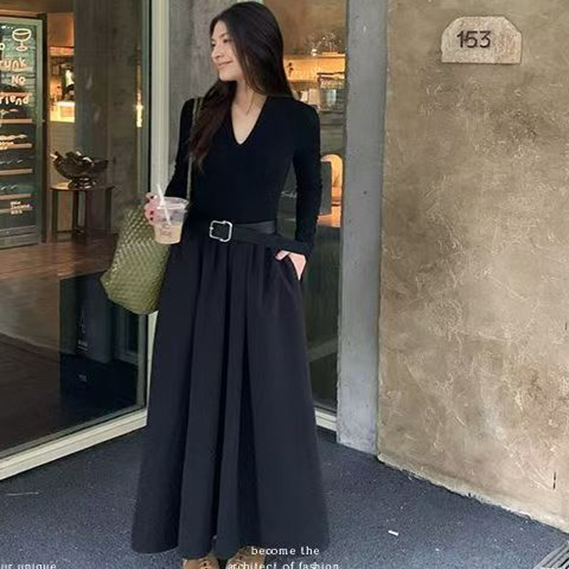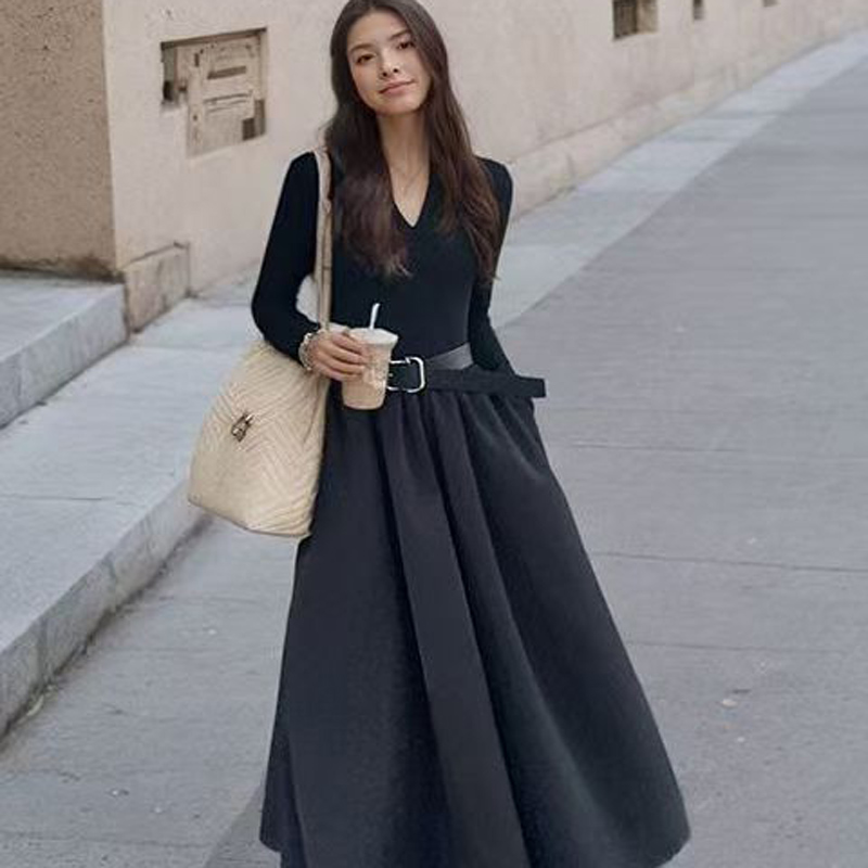 YF6231-图片色秋冬时尚赫本风长袖V领褶折感收腰显瘦过膝中长款连衣裙