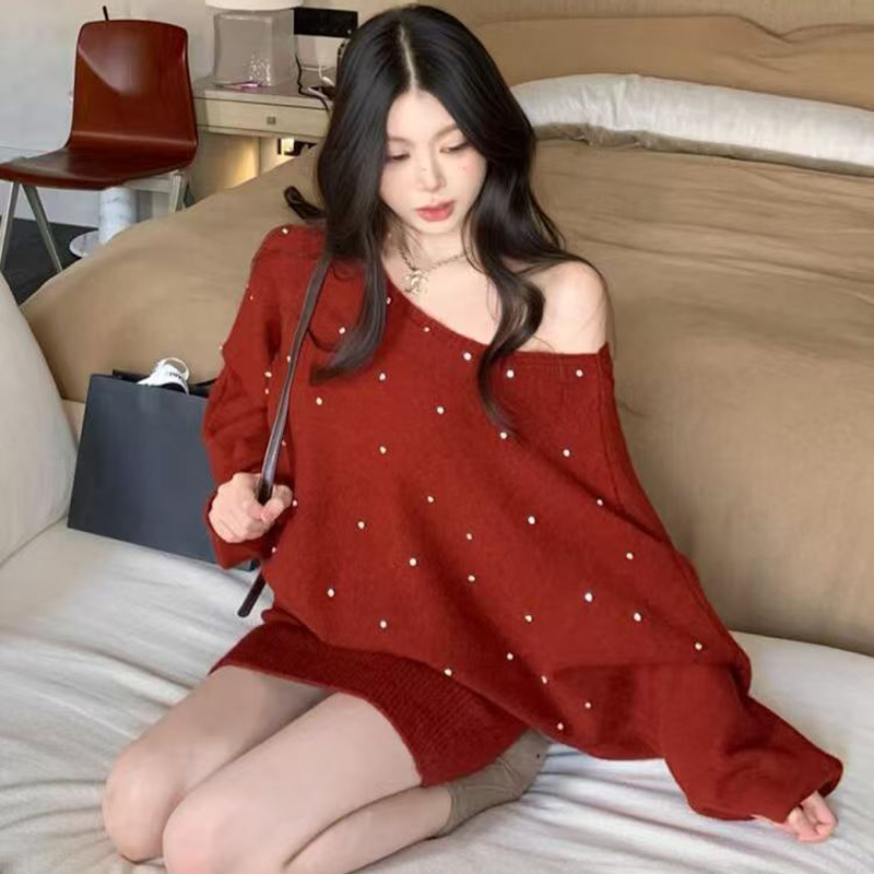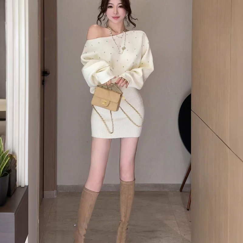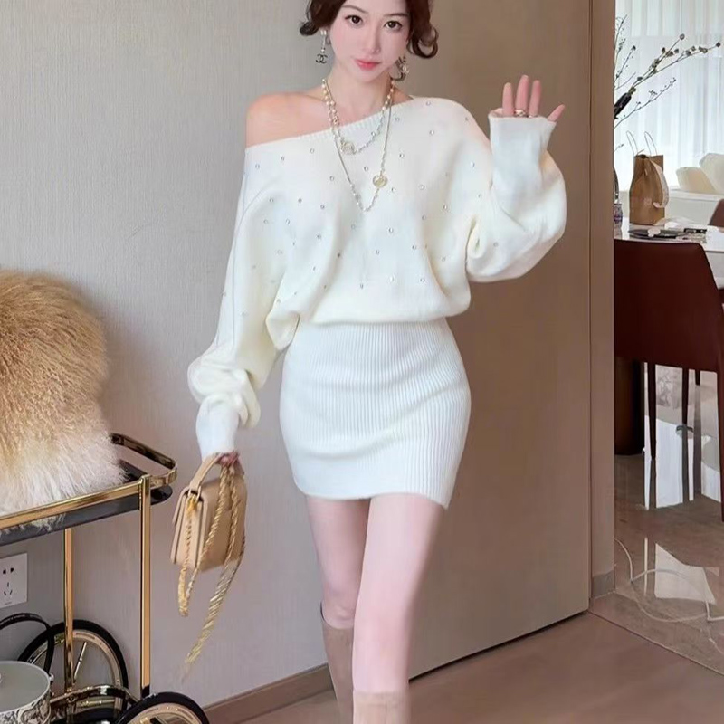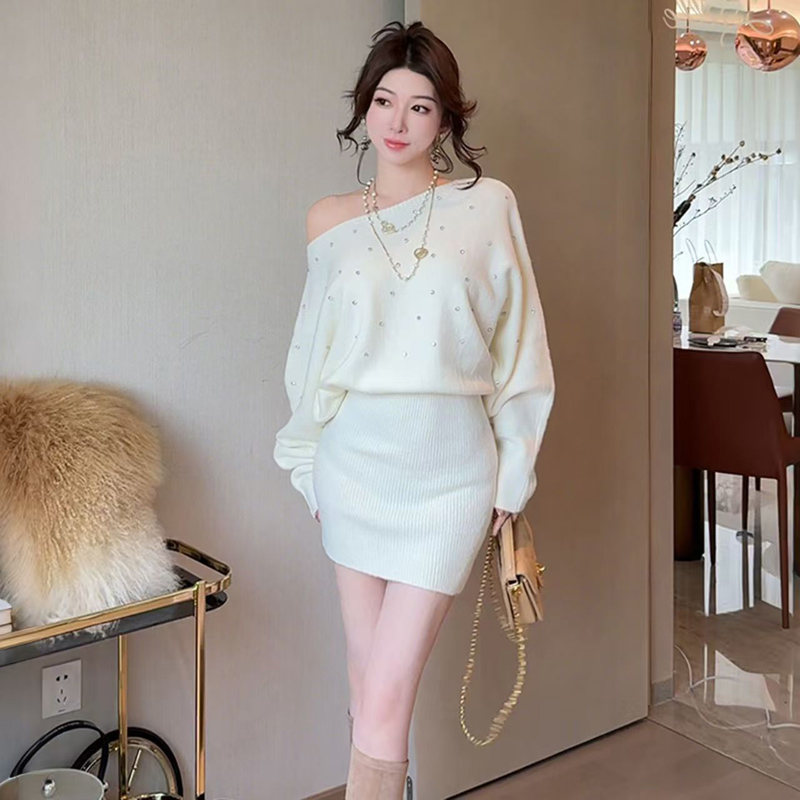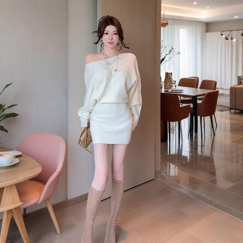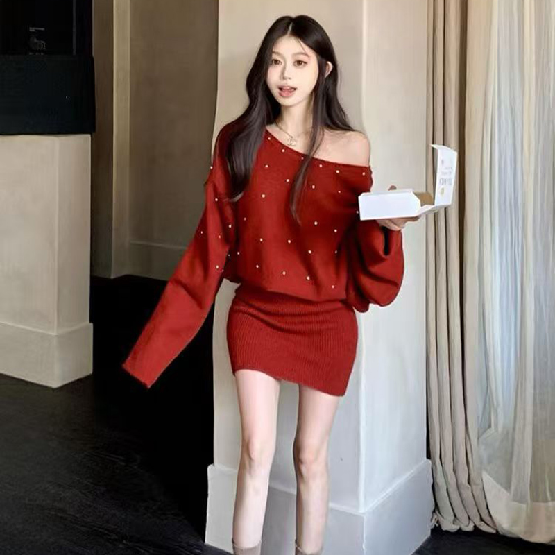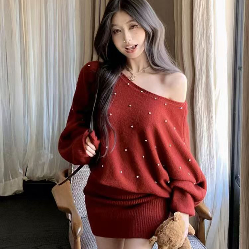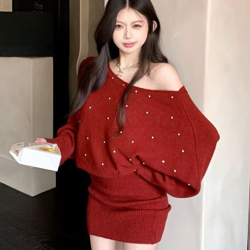 YF6232-(3色入内)冬装钉珠纯欲风性感露肩蝙蝠袖弹力包臀显瘦大码针织连衣