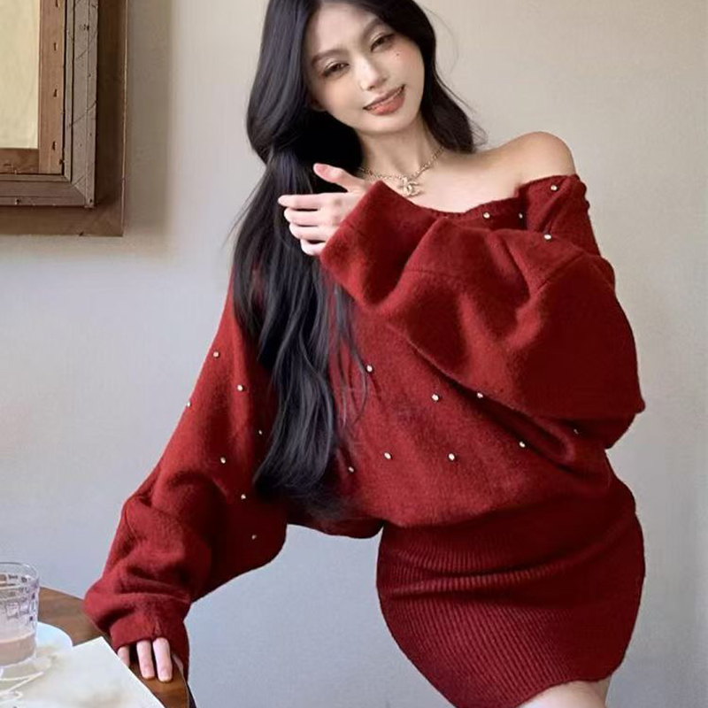YF6232-(3色入内)冬装钉珠纯欲风性感露肩蝙蝠袖弹力包臀显瘦大码针织连衣裙