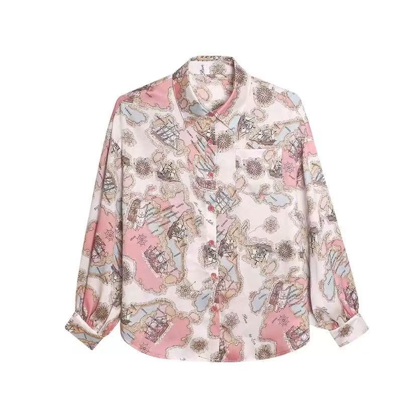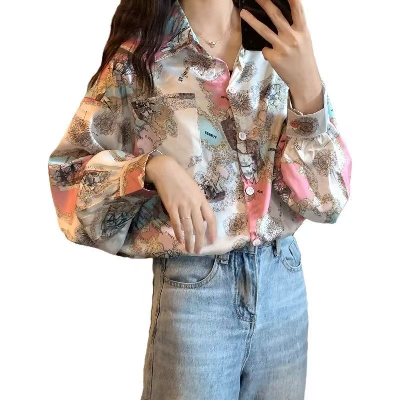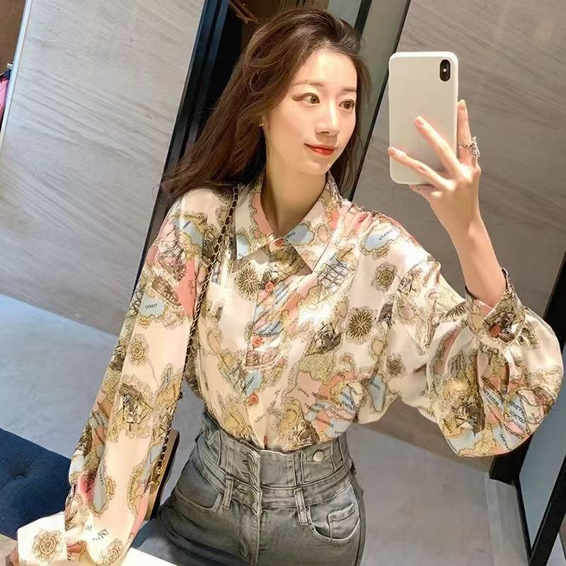 YF6234-图片色港风时尚碎花长袖翻领宽松大码春秋百搭打底衫  辣妹设计感上衣
