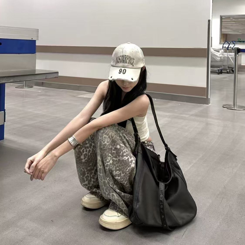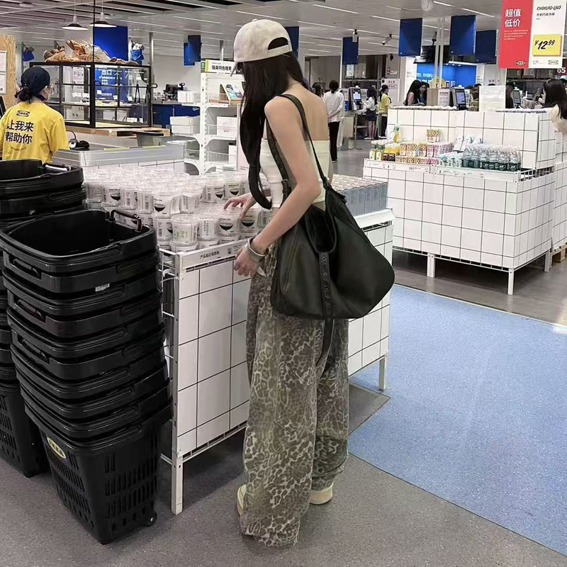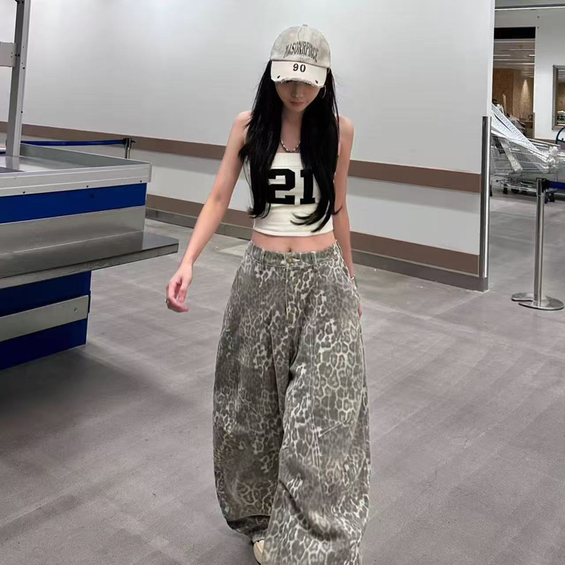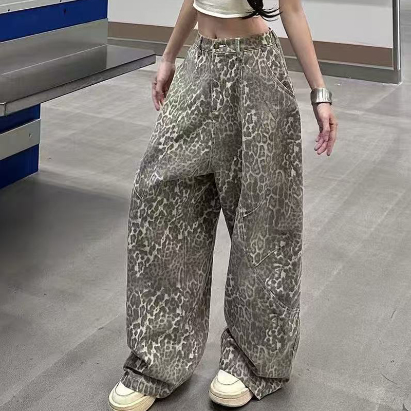 YF6237-图片色美式豹纹辣妹设计系扣高腰阔腿坠地感慵懒风复古牛仔裤