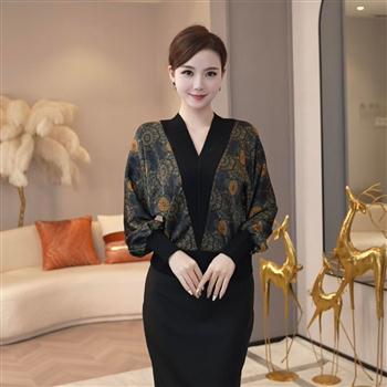 YF6244-图片色优雅时尚假两件拼接褶折长袖高领系扣修腰显瘦设计连衣裙