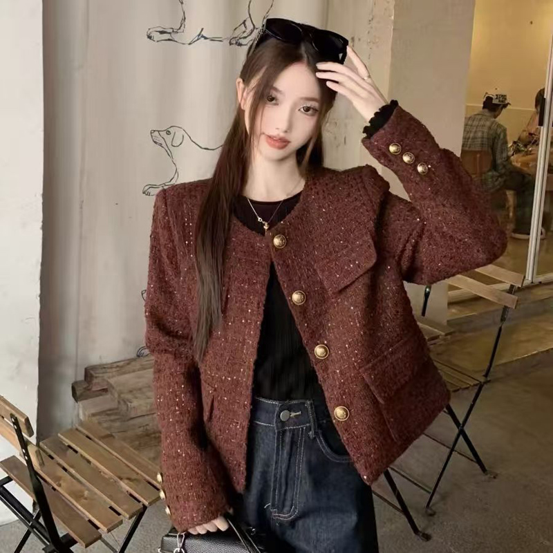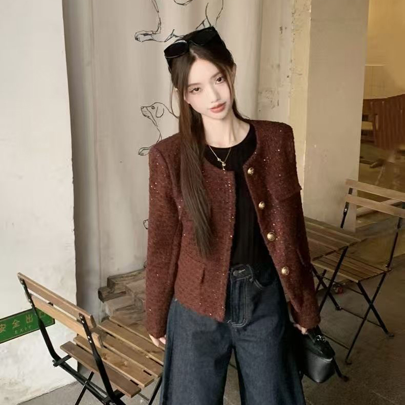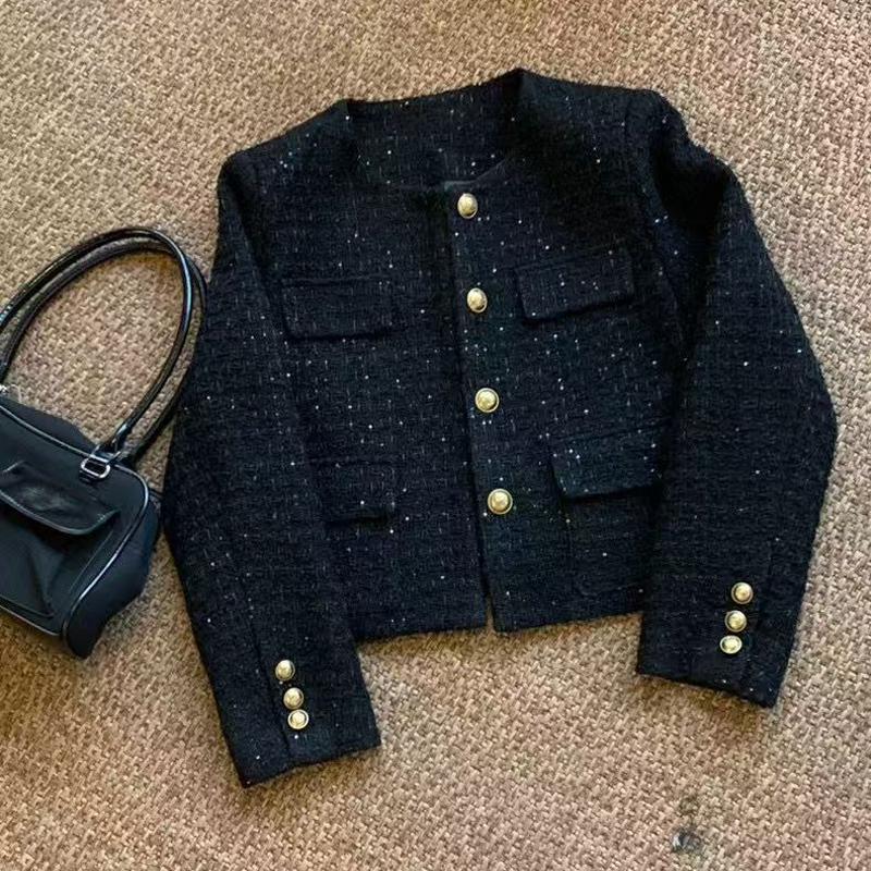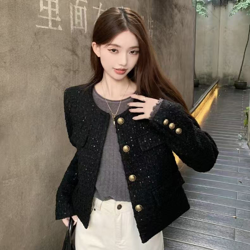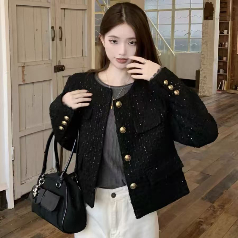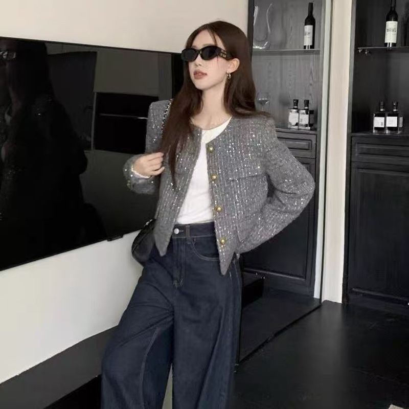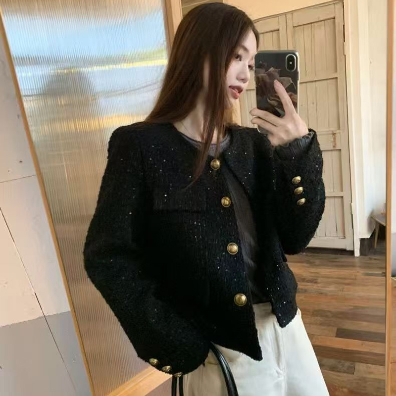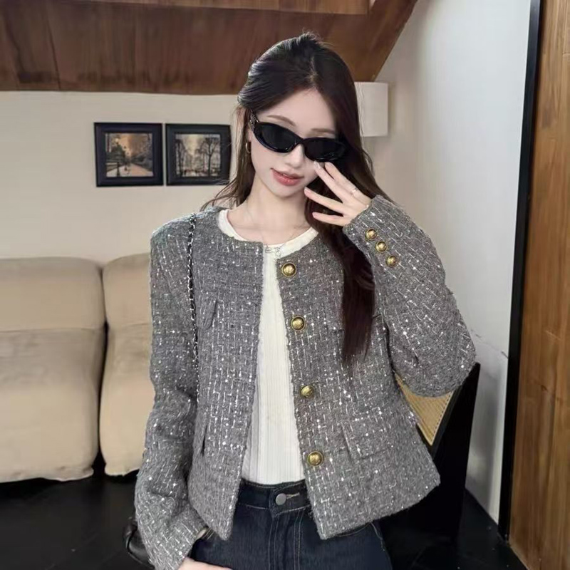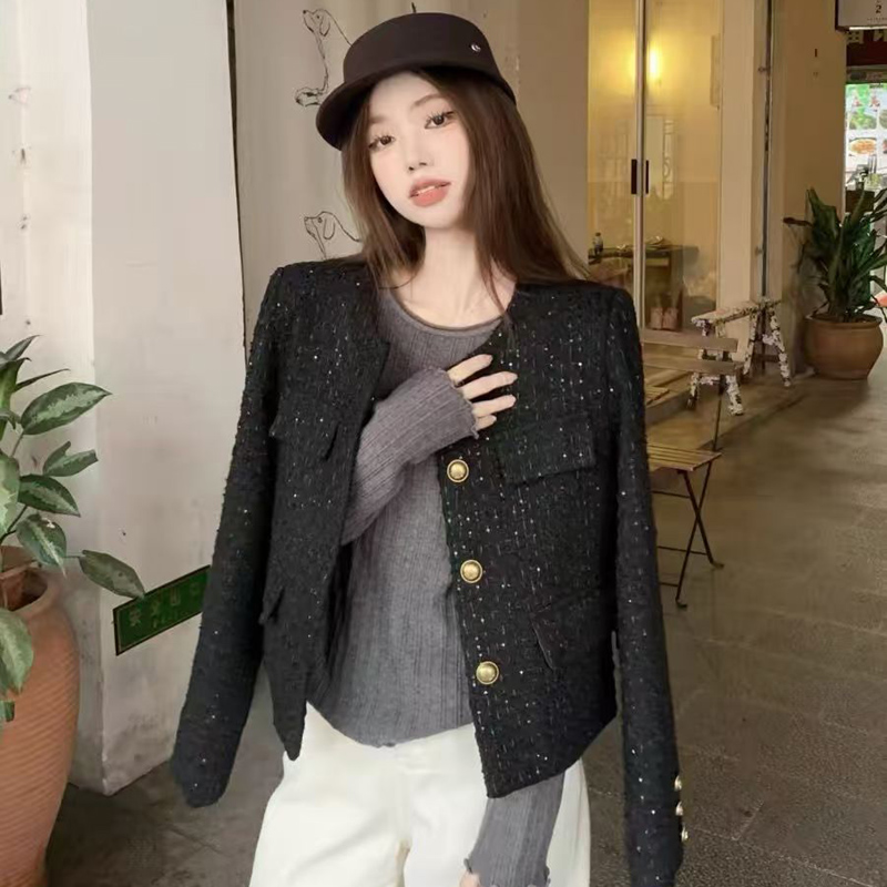 YF6247-(3色入内)时尚动感亮片设计长袖圆领系扣知款毛呢小香风上衣