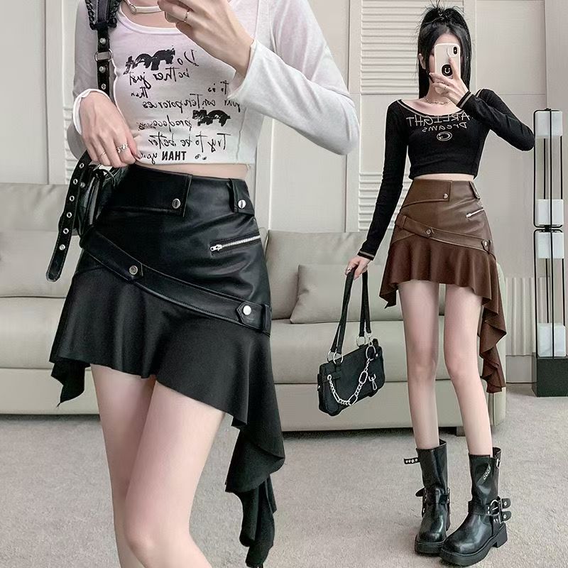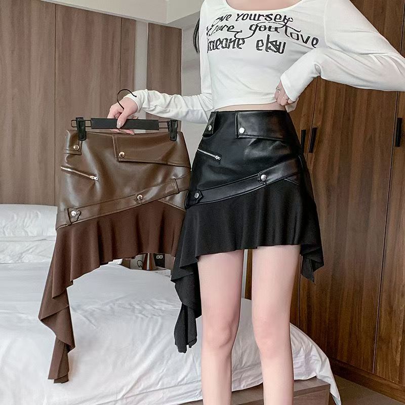 YF6252-(2色入内)性感时尚不规则飘带设计PU皮拉链口袋拼接褶折半身裙